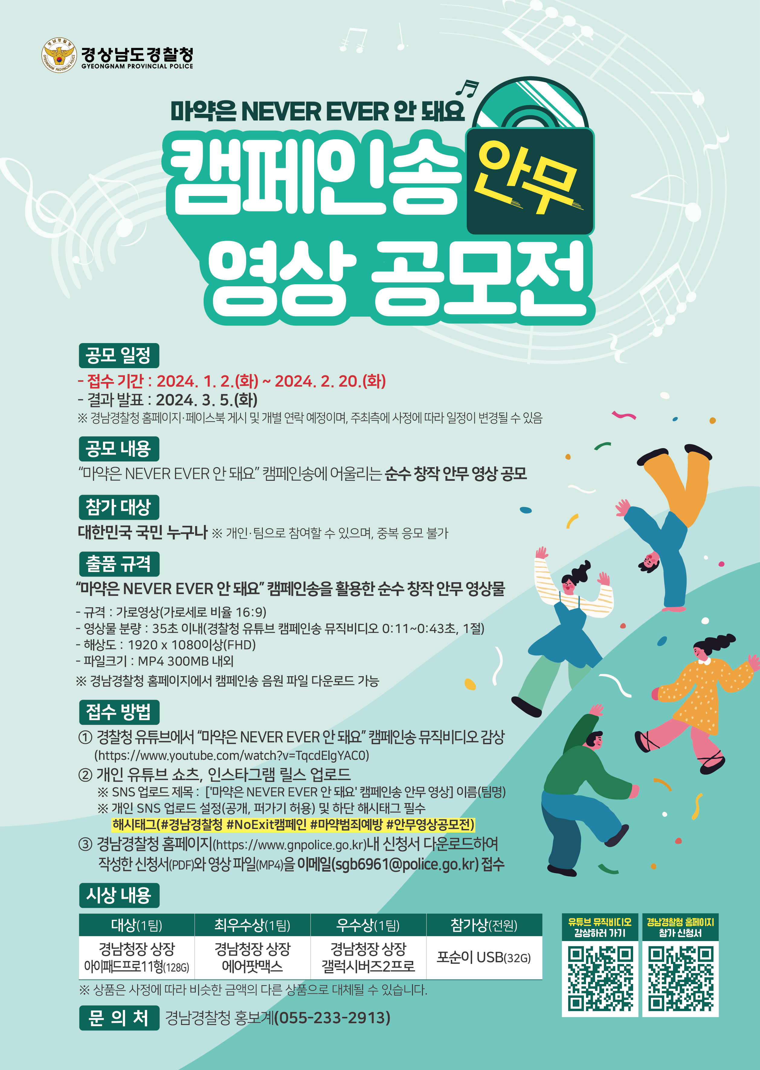 경남경찰청에서는 마약류 범죄에 대해 국민들의 경각심을 높이고자‘마약범죄 예방’ 「캠페인송 안무 영상」공모전 개최. □ 공모 개요 - 명 칭 : NO EXIT 「캠페인송 안무 영상」 공모전 - 기 간 : ’24. 1. 2.(화) ∼ 2. 20.(화) <50일간> - 대 상 : 모든 국민 - 활용곡 : 캠페인송 대상곡 ‘마약은 NEVER EVER 안돼요’ 의 1절 ★ 경찰청 유튜브(‘마약은 never ever 안돼요’ 검색) 0:11∼0:43 사이, 영상·음원 활용 - 응모주제 : 해당곡에 어울리는 창작 율동(안무) 영상(약 30초) - 제 출 물 : 영상 공모전 참가 신청서·영상 파일 □ 심사·시상 : 별도 계획(2·3월 中) ※ 발표 : 3. 5.(화) 예정 □ 포상 내용 ? 참가자 전원 기념품(포순이USB 1매) 우편 배송 - 상 장 : 경남청장 상장(대상1, 최우수1, 우수1) - 기념품 : 테블릿PC(1종), 블루투스 이어폰(2종)