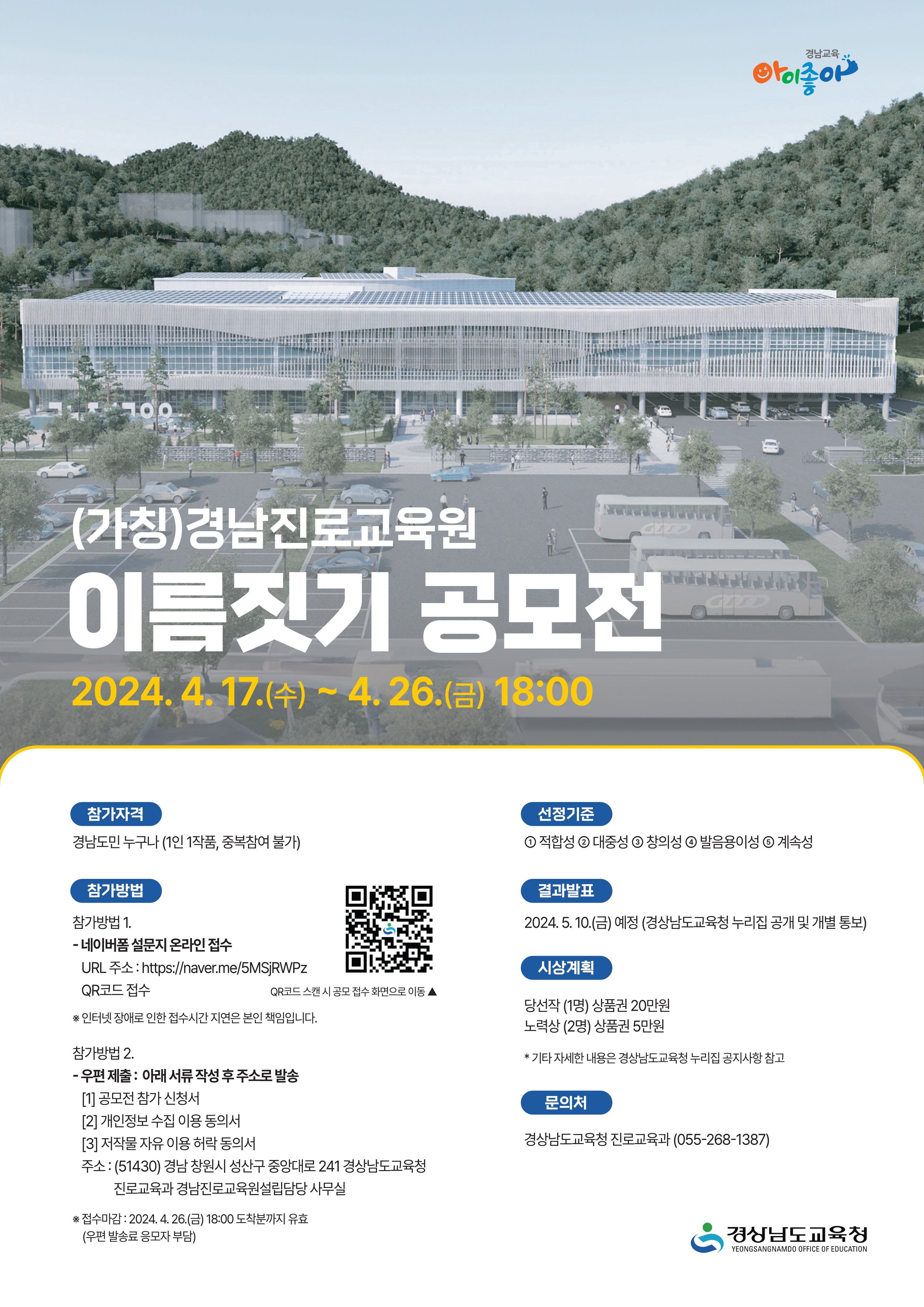 『(가칭)경남진로교육원』이름짓기 공모전을 다음과 같이 개최하니 관심있는 분들이 많이 참여할 수 있도록 안내해주시기 바랍니다. 가. 공 모 명: (가칭)경남진로교육원 이름짓기 공모 나. 공모기간: 2024. 4. 17.(수) ~ 4. 26.(금) 18:00까지 다. 참가자격: 경남도민 누구나 (1인 1작품, 중복참여 불가) 라. 응모방법 1) 온라인 참여: URL주소 접속 후 해당 내용 작성 제출 2) 우편제출: 붙임 서식(1~3) 작성 후 아래 주소로 우편 발송 (51430) 경남 창원시 성산구 중앙대로 241 경상남도교육청 진로교육과 경남진로교육원설립담당 사무실 마. 결과발표: 2024. 5. 10.(금) 예정, 경상남도교육청 누리집 공개 및 개별 통보 붙임 1. (가칭)경남진로교육원 이름짓기 공모전 계획(요약) 1부. 2. (가칭)경남진로교육원 이름짓기 공모전 계획 1부. 3. (가칭)경남진로교육원 이름짓기 공모전 제출 서식(1~3) 1부.