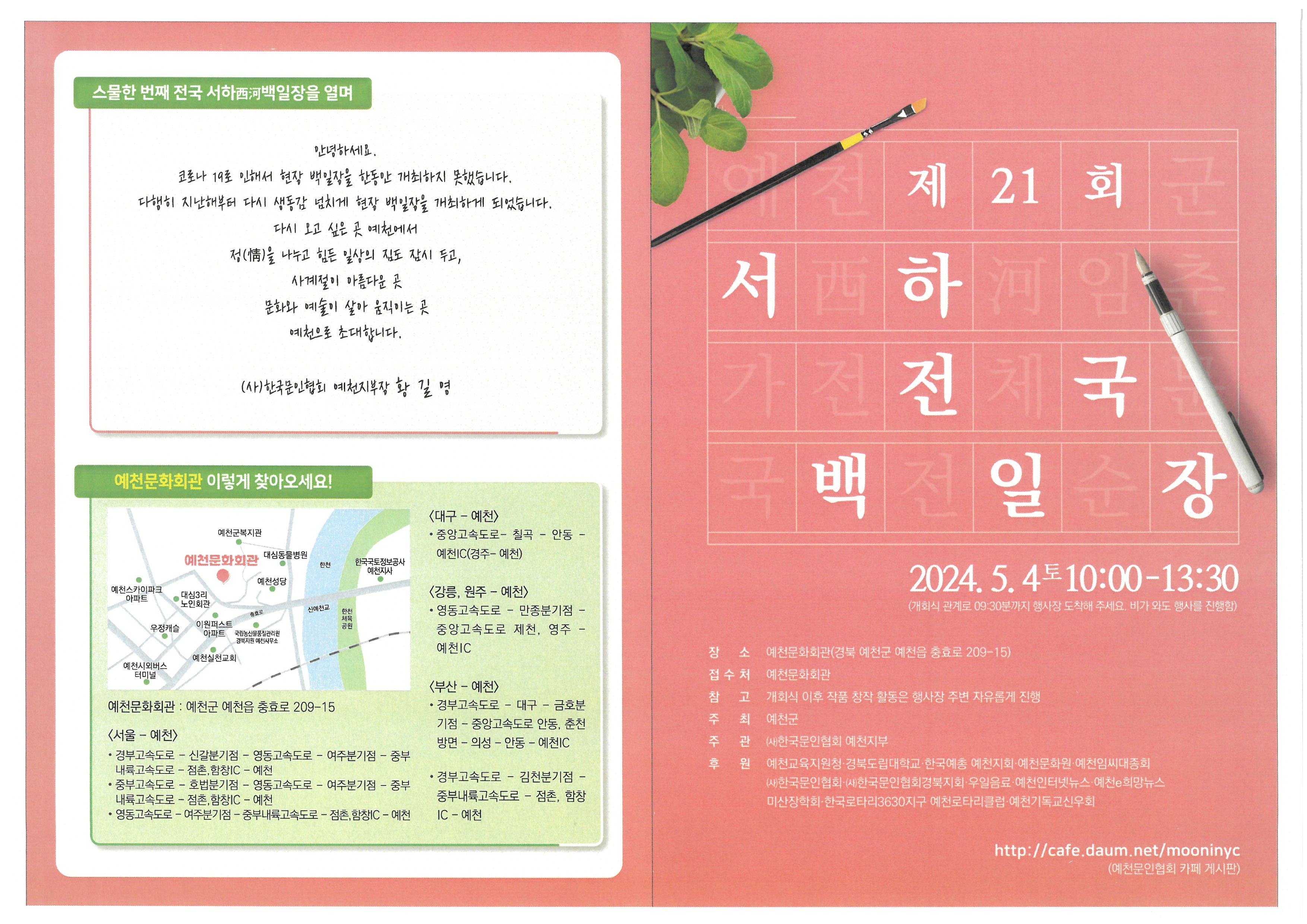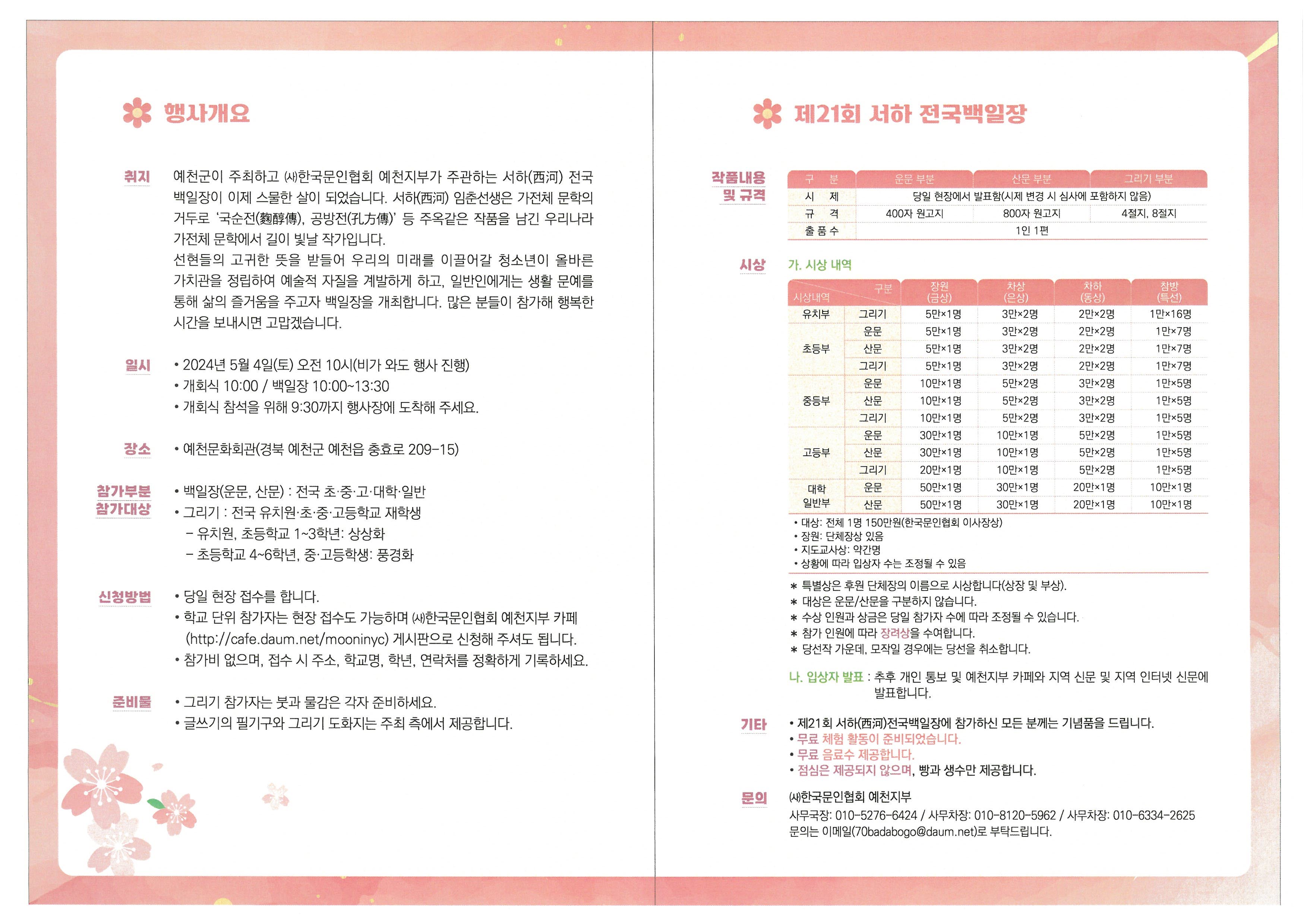 □ 행사개요 ○ 행사명 : 제21회 서하 전국백일장 ○ 일 시 : 2024. 5. 4.(토) 10:00 ~ 13:30 ○ 장 소 : 예천군문화회관(예천군 예천읍 충효로 209-15) ○ 참가부문 및 대상 - 백일장(운문, 산문) : 전국 초·중·고· 대학·일반 - 그리기 : 전국 유치원, 초·중·고등학교 재학생 유치원 ~ 초등학교 3학년 : 상상화 초등학교 4학년 ~ 고등학생 : 풍경화 ○ 참가 신청방법 : 붙임참고