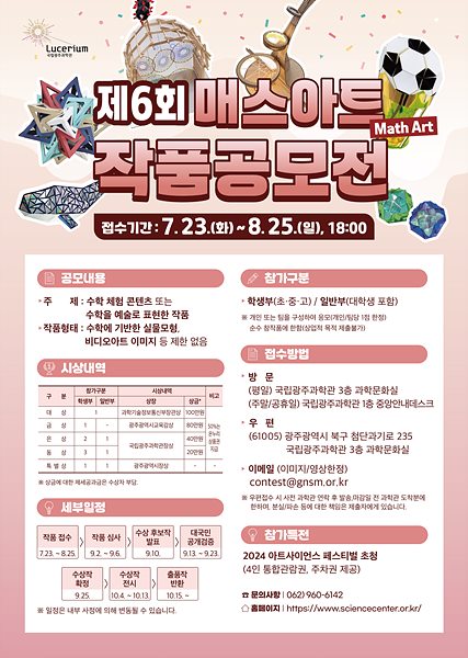 수학적 원리를 예술로서 체험하고, 수학적 창의력 증진을 위해 ‘제6회 매스아트(Math Art) 작품공모전’을 아래와 같이 개최. 가. 공 모 명: 국립광주과학관 제6회 매스아트(Math Art) 작품공모전 나. 접수기간: 2024. 7. 23.(화) ~ 8. 25.(일), 18:00까지 다. 참가구분: 학생부(초?중?고), 일반부(대학생 포함) 라. 접수방법: 우편 또는 방문접수(참가신청서와 작품제출) 마. 작품형태: 수학에 기반한 실물모형, 비디오아트, 이미지 등 제한없음 바. 시 상: 과학기술정보통신부장관상 등 총 11팀, 총상금 380만원 사. 문 의: 과학문화실 062) 960-6142 ※ 상세 내용은 첨부파일 참조 바랍니다.