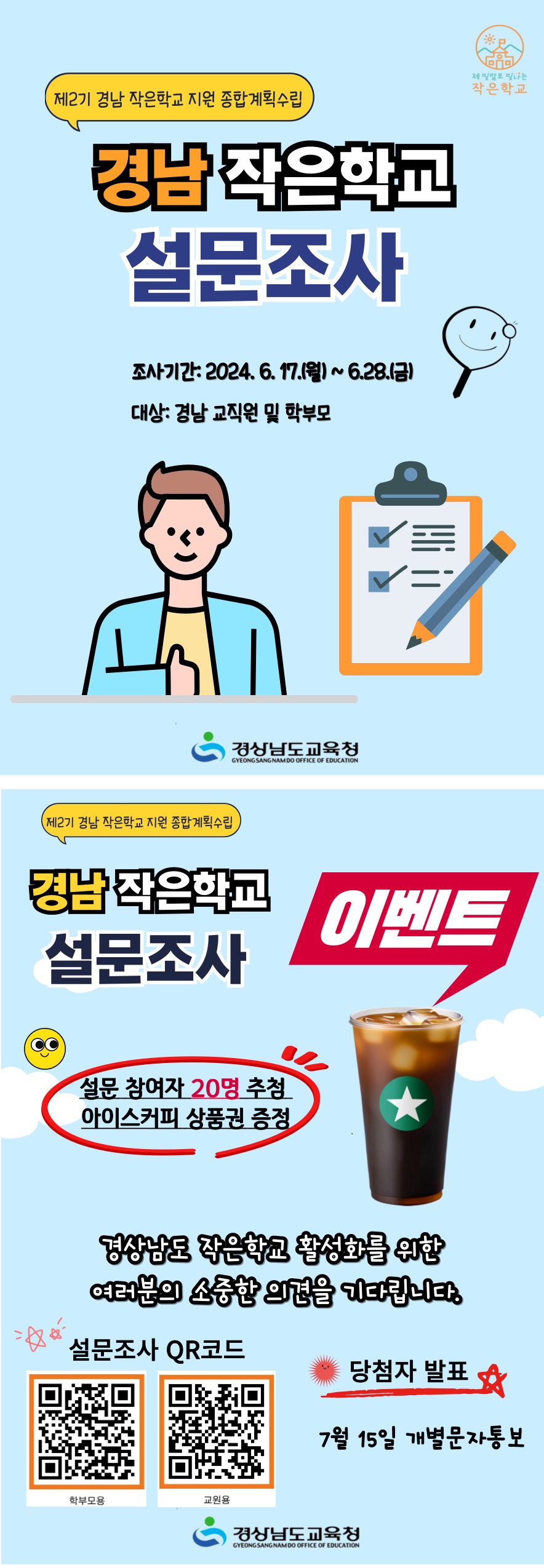1. 초등교육과-11775(2024. 6. 14.)호와 관련됩니다. 2. 작은학교에 대한 교직원·학부모의 다양한 의견수립을 통해 교육공동체가 공감하는 제2기(2024.~2027.) 작은학교 지원 종합 계획 수립을 위한 설문조사를 아래와 같이 실시 하오니 많은 참여 바랍니다. 가. 제목: 제2기 경남 작은학교 지원 종합계획 수립을 위한 설문조사 나. 대상: 경남 학부모 다. 설문시기: 2024. 6. 17.(월) ~ 6. 28.(금)까지 라. 설문주소 - (학부모용) https://naver.me/xQ8KEJ6T 마. 경품내역: 참석자 20명 추첨 아이스커피 상품권 증정 붙임 작은학교 설문조사 카드뉴스 1부. 끝.