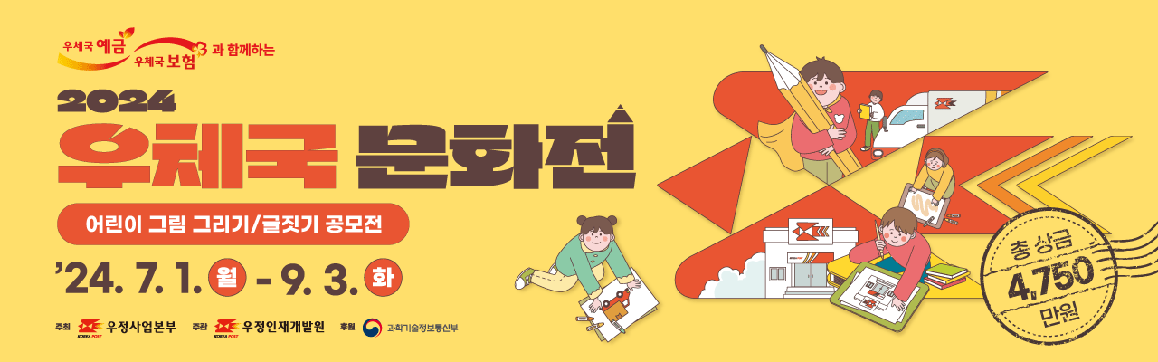 과학기술정보통신부 우정사업본부에서는 어린이, 청소년의 문화참여 기회제공을 통한 정서함양 지원 및 우체국 이미지 제고를 위하여 다음과 같이「2024 우체국문화전」을 개최합니다.
