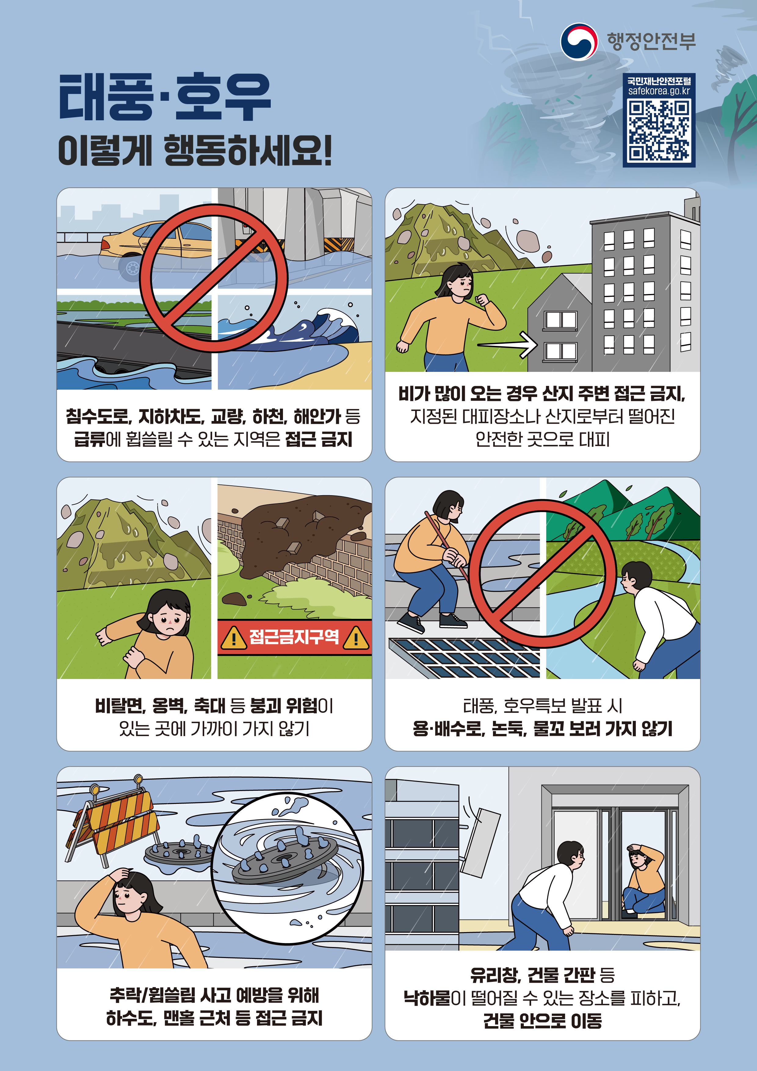 여름철 자연재난(호우.태풍)으로 인한 피해를 최소화하기 위해 행정안전부는 국민행동요령 콘텐츠