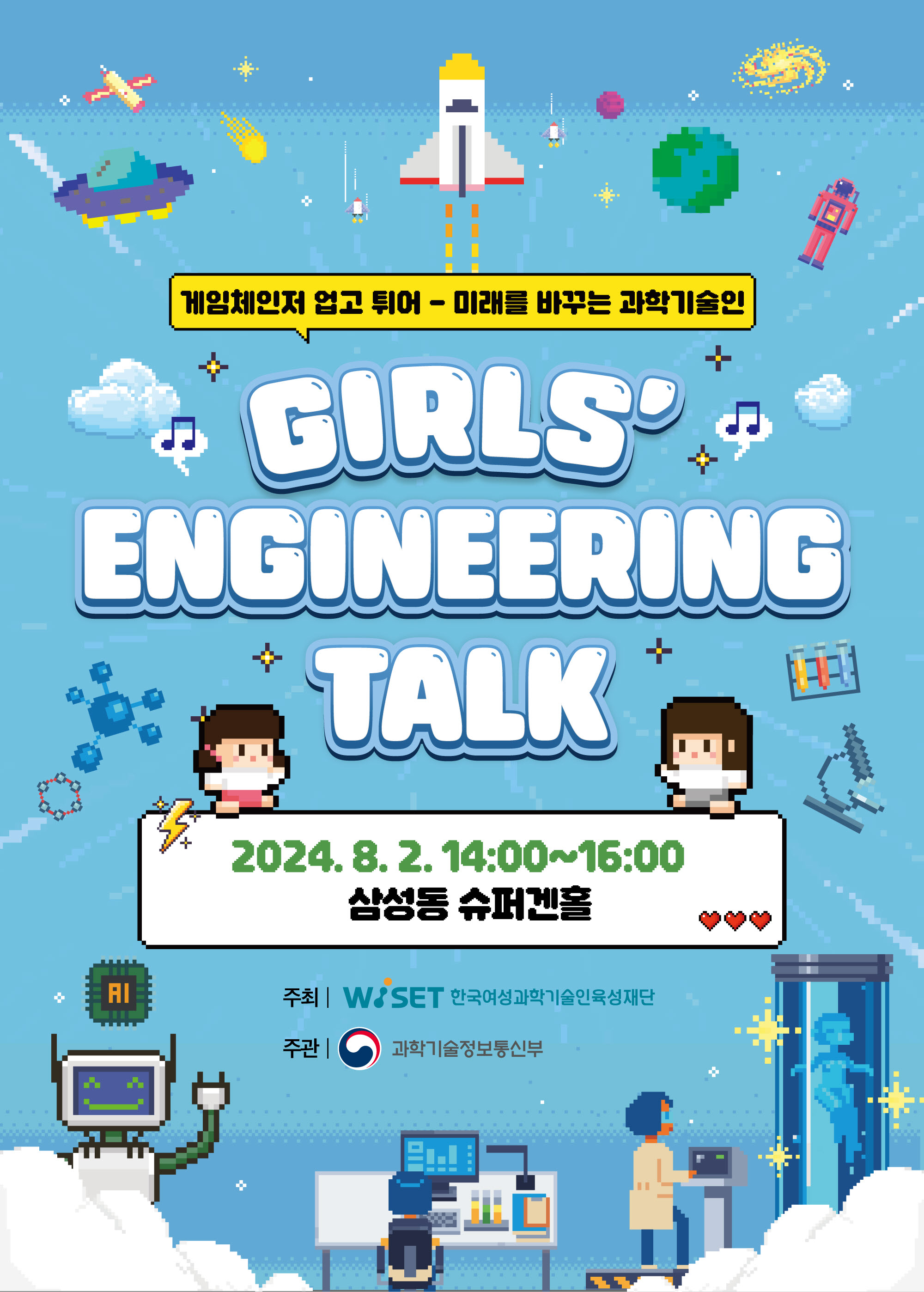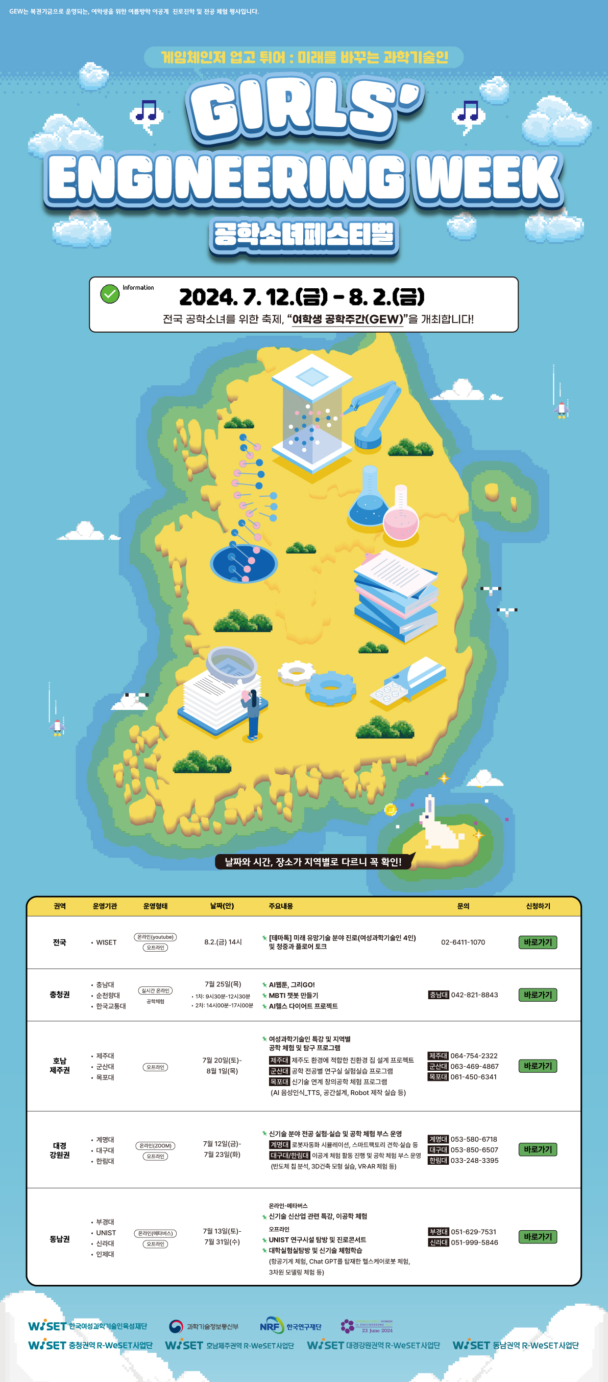 가. 행 사 명 : 2024년도 여학생 공학주간(GEW) : 공학소녀 페스티벌 나. 주 제 : 게임체인저 업고 튀어 : 미래를 바꾸는 과학기술인 다. 일 시 : 2024.7.12.(금) ~ 8.2.(금) 라. 장 소 : 지역별 지정장소 및 온라인 마. 대 상 : 전국 중학교 및 고등학교 여학생 바. 주요내용 - 지역별 여중.고생 대상 온.오프라인 공학전공 체험활동 및 연구실 견학, 특강, 멘토링 등 행사 개최 - 여학생공학주간 강연회 GET(Girls' Engineering Talk) 개최 사. 주 관 : R-WeSET 권역사업단(4개) 아. 주 최 : 한국여성과학기술인육성재단 자. 후 원 : 과학기술정보통신부, 한국연구재단, INWED 등