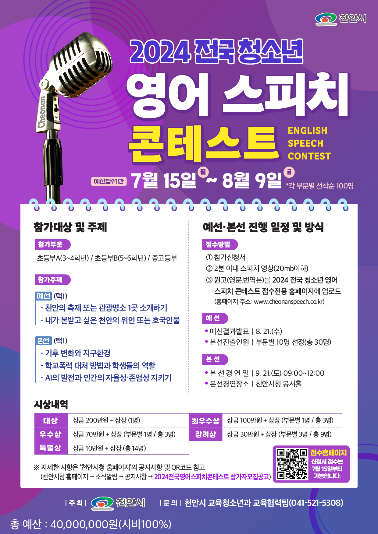 『2024 전국 청소년 영어 스피치 콘테스트』 ○ (주 제) - 예선: ① 또는 ② 중에 선택 【① 천안의 축제 또는 관광명소 1곳 소개하기 ② 내가 본받고 싶은 천안의 위인 또는 호국인물 中 택1】 - 본선: 공고문 확인 ○ (접수기간) 2024.7.15(월) ~ 8.9.(금) ※ 3개 부문별 선착순 100명 ○ (참가자격) 전국 초(3~6학년).중.고등학생(학교 밖 청소년 포함) ○ (시 상) 총 30명 상장 및 상금 수여 ⇒ 대상 200만원(1명)/최우수상 100만원(3명)/우수상 70만원(3명)/장려상 30만원(9명)/특별상 10만원(14명) ○ (문 의) 천안시 교육청소년과 교육협력팀 041-521-5308 /※ 자세한 사항은 붙임 공고문 확인 |