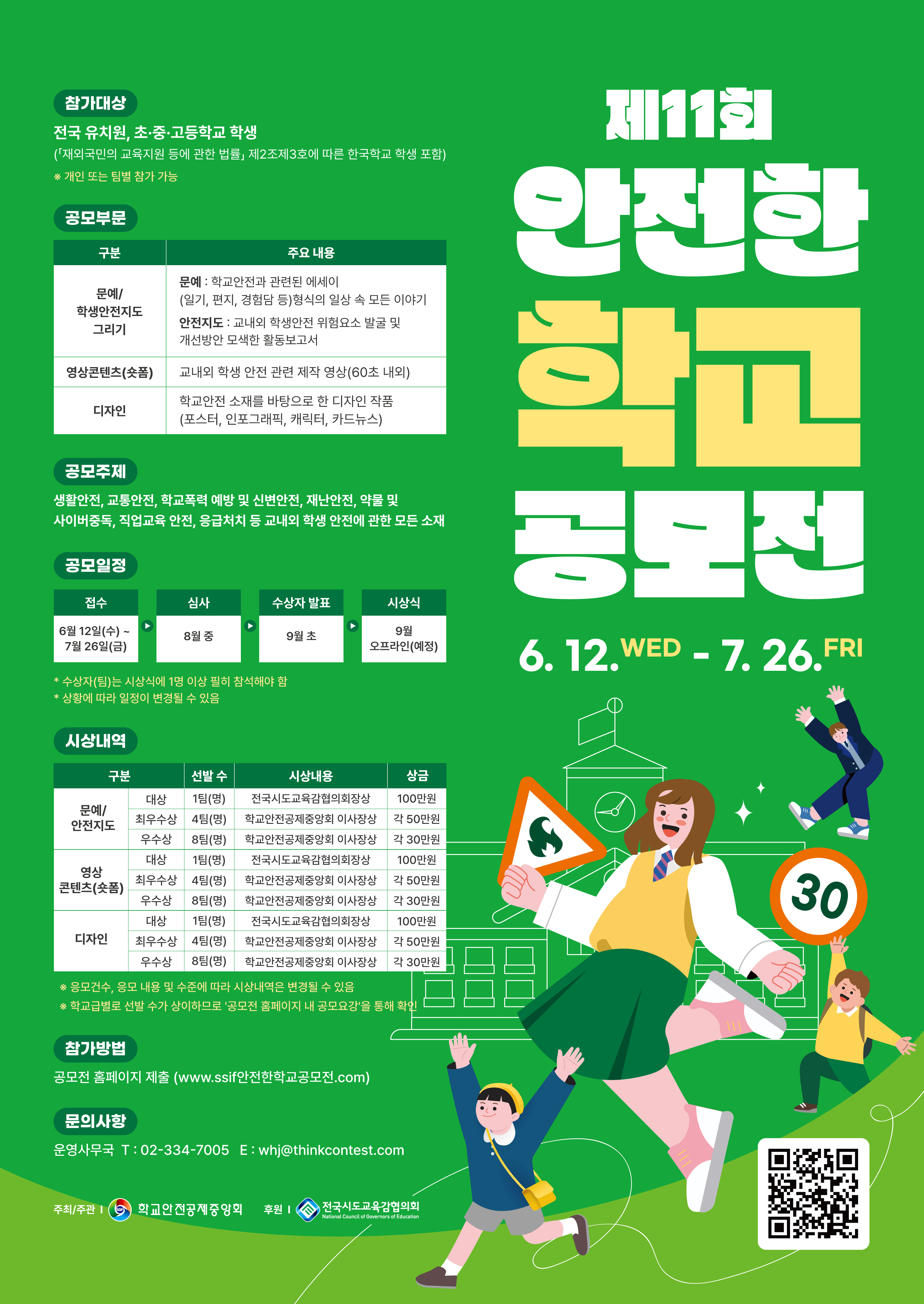 학교안전공제중앙회는 학교안전에 대한 경각심을 고취하고 사회적 관심을 유도하기 위해 「제11회 안전한 학교 공모전」을 개최합니다. 가. 공 모 명 :제11회 안전한 학교 공모전 나. 공모기간 : 2024. 6. 12.(수) ~ 7. 26.(금) ※ 시상일시 : '24. 9월 중 다. 참가대상 :전국 유, 초, 중, 고등학교 학생 및 재외한국학생 라. 공모부문 : ①문예·학생안전지도 그리기 ②영상콘텐츠(숏폼) ③디자인 마. 주최/주관 : 학교안전공제중앙회 바. 후 원 : 전국시도교육감협의회 사. 접수방법 : 온라인 접수(https://ssif안전한학교공모전.com) 아. 협조사항 : 소속 교육지원청 및 각급 학교에 공모전 안내 및 홍보 자. 관련문의 : (주)씽굿 운영사무국(☎ 02-334-7005) 붙임 1. 제11회 안전한 학교 공모전 추진계획 1부. 2. 안전한학교 공모전 1부. 끝.