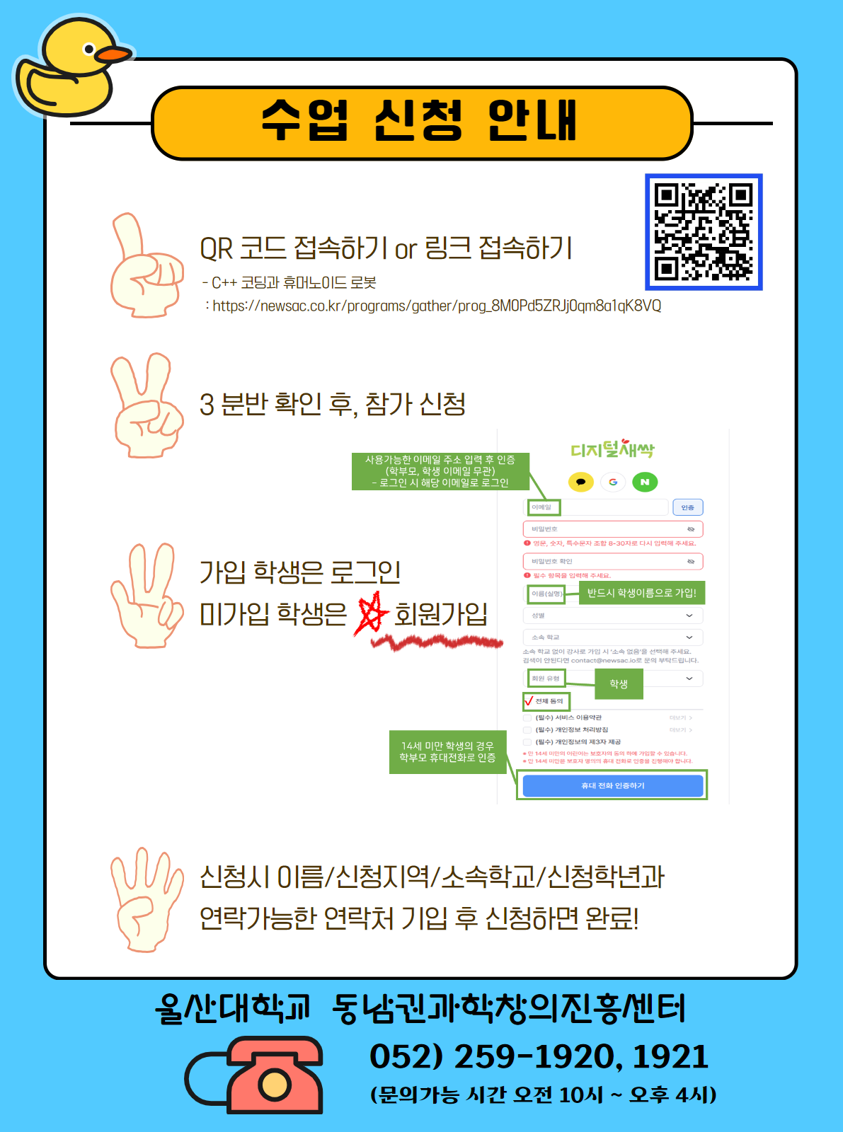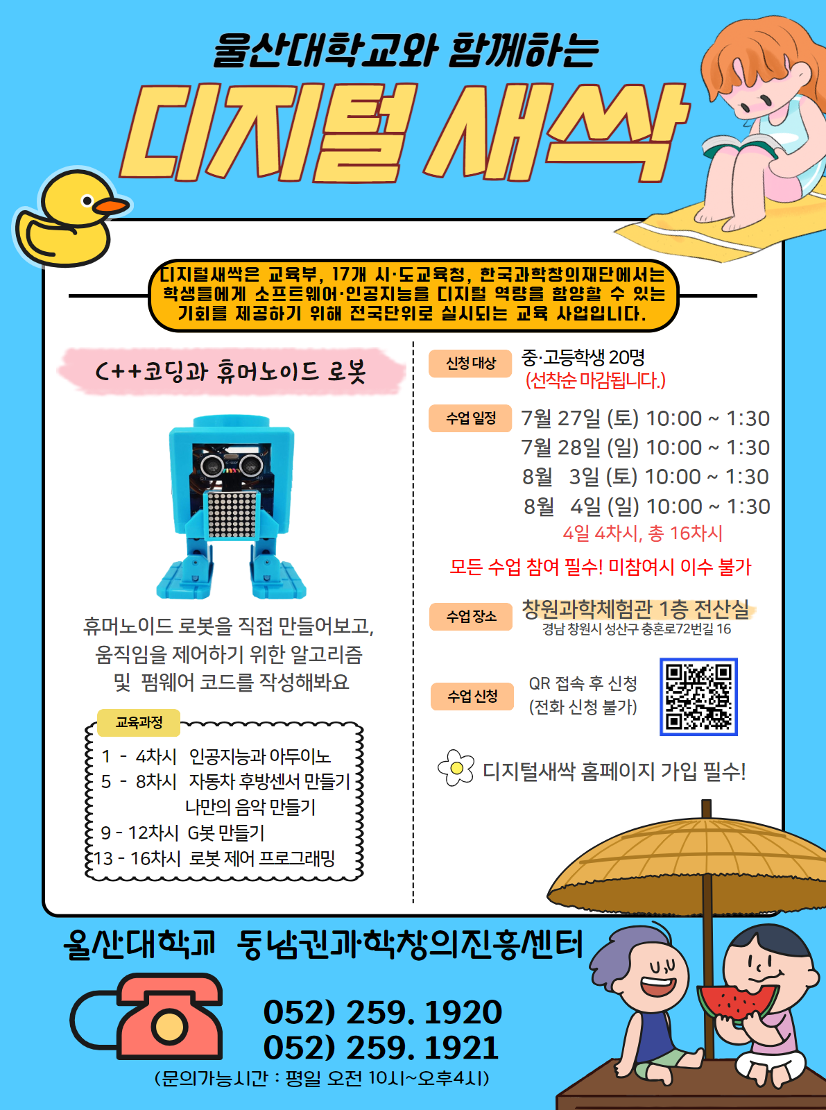 교육부, 17개 시·도 교육청, 한국과학창의재단에서는 초·중·고등학생들이 디지털 인재로 거듭날 수 있도록 <디지털새싹> 사업을 진행합니다. 관련하여, 울산대학교에서는 중·고등학생들을 대상으로 아래와 같이 디지털 새싹 수업을 운영. - 아 래 - 1) 수업 일정 : 7월 27일(토), 28일(일), 8월 3일(토), 4일(일) 오전 10시 ~ 오후 1시 30분 2) 신청 기간 : ~ 7월 16일(목) 16:00 (수업 별 신청 기간 상이) (목표 인원 달성 시 조기 마감될 수 있습니다) 3) 수업 장소 : 창원과학체험관 1층 전산실 4) 신청 방법 : 디지털새싹 홈페이지에서 직접 신청 (자세한 신청 방법은 붙임2 참고) 5) 문 의 처 : 울산대학교 동남권과학창의진흥센터, 052-259-1920, 1921 6) 협조 사항 : 교내 게시판 등을 이용한 안내 및 홍보 7) 기타 사항은 붙임 파일을 참고하시길 바랍니다. 붙임1. 울산대학교와 함께하는 디지털새싹 안내문 붙임2. 울산대학교와 함께하는 디지털새싹 신청 방법 안내