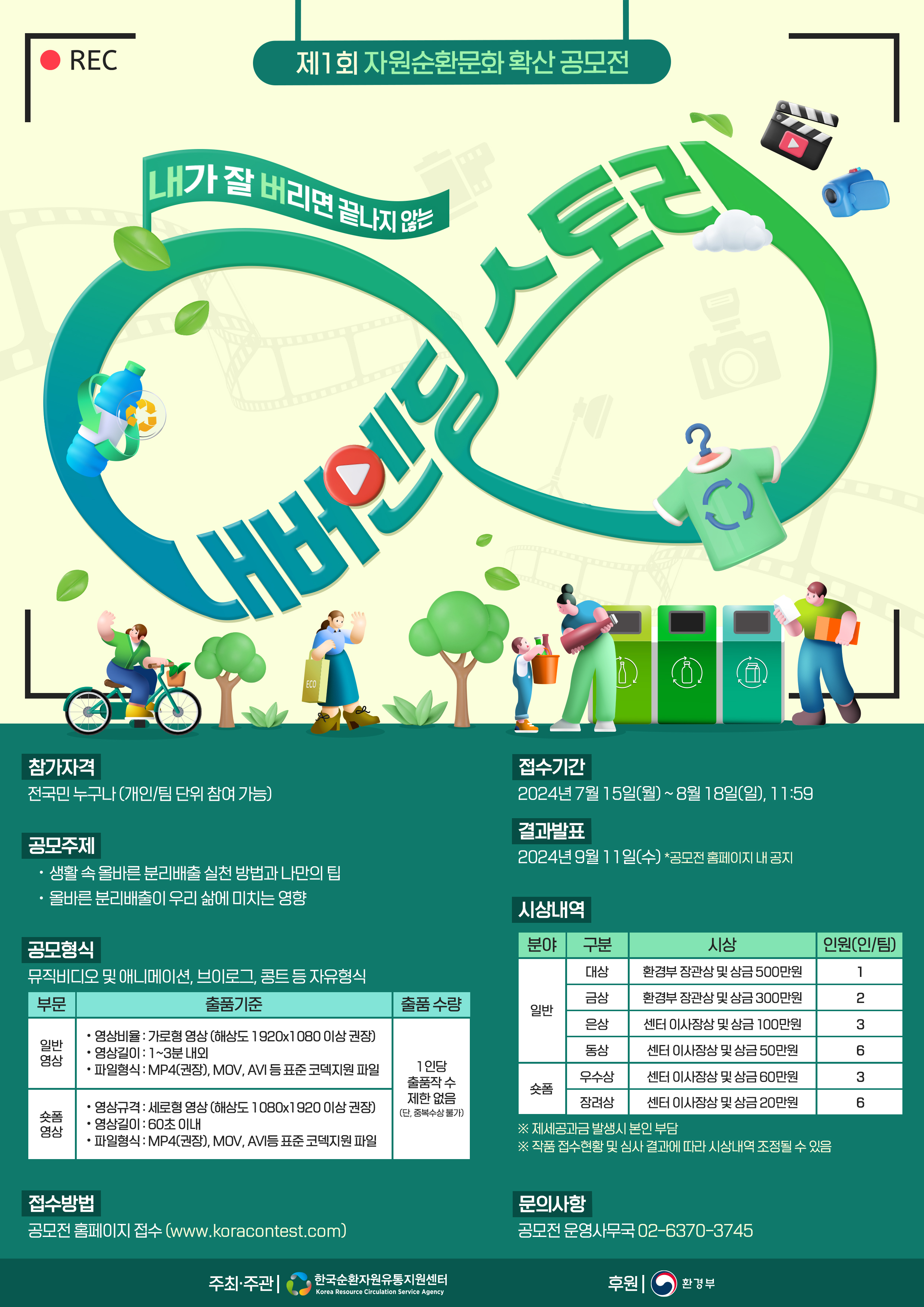 한국순환자원유통지원센터가 환경부와 함께 자원순환과 순환경제에 대한 긍정 인식 제고 및 대국민 실천문화 확산을 위해 '제1회 자원순환문화 확산 공모전「내버엔딩스토리」'를 개최합니다. - 아 래 - 가. 공모전명 : 제1회 자원순환문화 확산 공모전「내버엔딩스토리」 나. 공모주제 - 생활속 올바른 분리배출 실천 방법과 나만의 팁 - 올바른 분리배출이 우리 삶에 미치는 영향 다. 공모형식 : 일반영상 및 숏폼영상 부문(자유형식) 라. 참가자격 : 전국민 누구나(개인/팀 단위 참여 가능) 마. 시상내역 : 총 상금 2,000만원(총 21편) 바. 접수기간 : 2024.7.15.(월) ~ 8.18.(일) ※결과발표 : 2024.9.11.(수) 사. 접수방법 : 공모전 홈페이지 접수 (www.koracontest.com) 아. 문의사항 : 공모전 운영사무국 02-6370-3745(평일 10:00 ~ 17:00) 붙임1. (공모전 안내문) 제1회 자원순환문화 확산 공모전 붙임2. (가정통신문) 제1회 자원순환문화 확산 공모전 붙임3. (홍보 포스터) 제1회 자원순환문화 확산 공모전 붙임4. (공문) 제1회 자원순환문화 확산 공모전_KORA 끝.