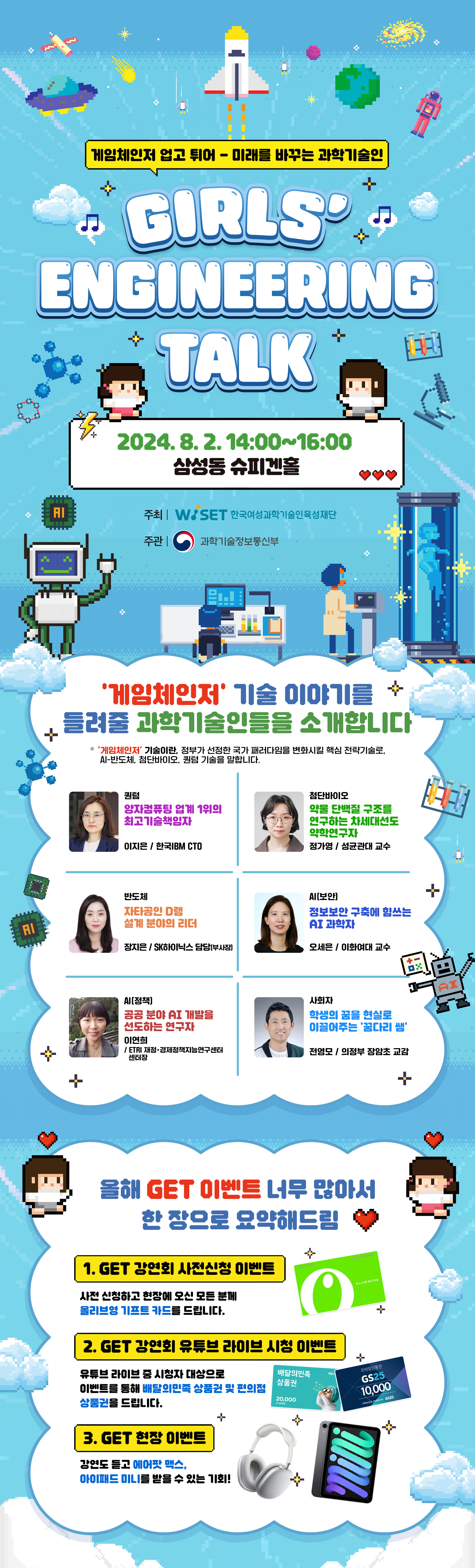 □ 여학생 공학주간 강연회(GET) 행사 개요 가. 주 제: 게임체인저 업고 튀어 ? 미래를 바꾸는 과학기술인 나. 일자/장소: 2024. 8. 2.(금) 14:00 ~ 16:00 / 슈피겐홀 다. 대 상: 중·고등 여학생, 학부모, 교사 등 (당일 유트브 온라인 생중계 병행) 라. 주최/후원: 한국여성과학기술인육성재단(WISET)/과학기술정보통신부 마. 주요 일정 구분 | 시간 | 내용 | 비고 | 개회 | 14:00-14:10 | 10` | - 문애리 WISET 이사장 | | 테마Talk | 14:10-15:40 | 50` | - 미래 유망기술 분야 진로(여성과학기술인 5인) (퀀텀) 이지은 한국 IBM CT0 (첨단바이오) 정가영 성균관대 교수 (반도체) 장지은 SK 하이닉스 담당 (AI/보안) 오세은 이화여대 교수 (AI/정책) 이연희 ETRI 경제정책지능연구센터 센터장 | 각 10분 강연 | 40` | - 온·오프라인 청중과 플로어토크(Q&A) | 테마Talk 강연자 5인 | 폐회 | 15:40-16:00 | 20` | - 현장소통이벤트 및 폐회 | 경품추첨 등 |
