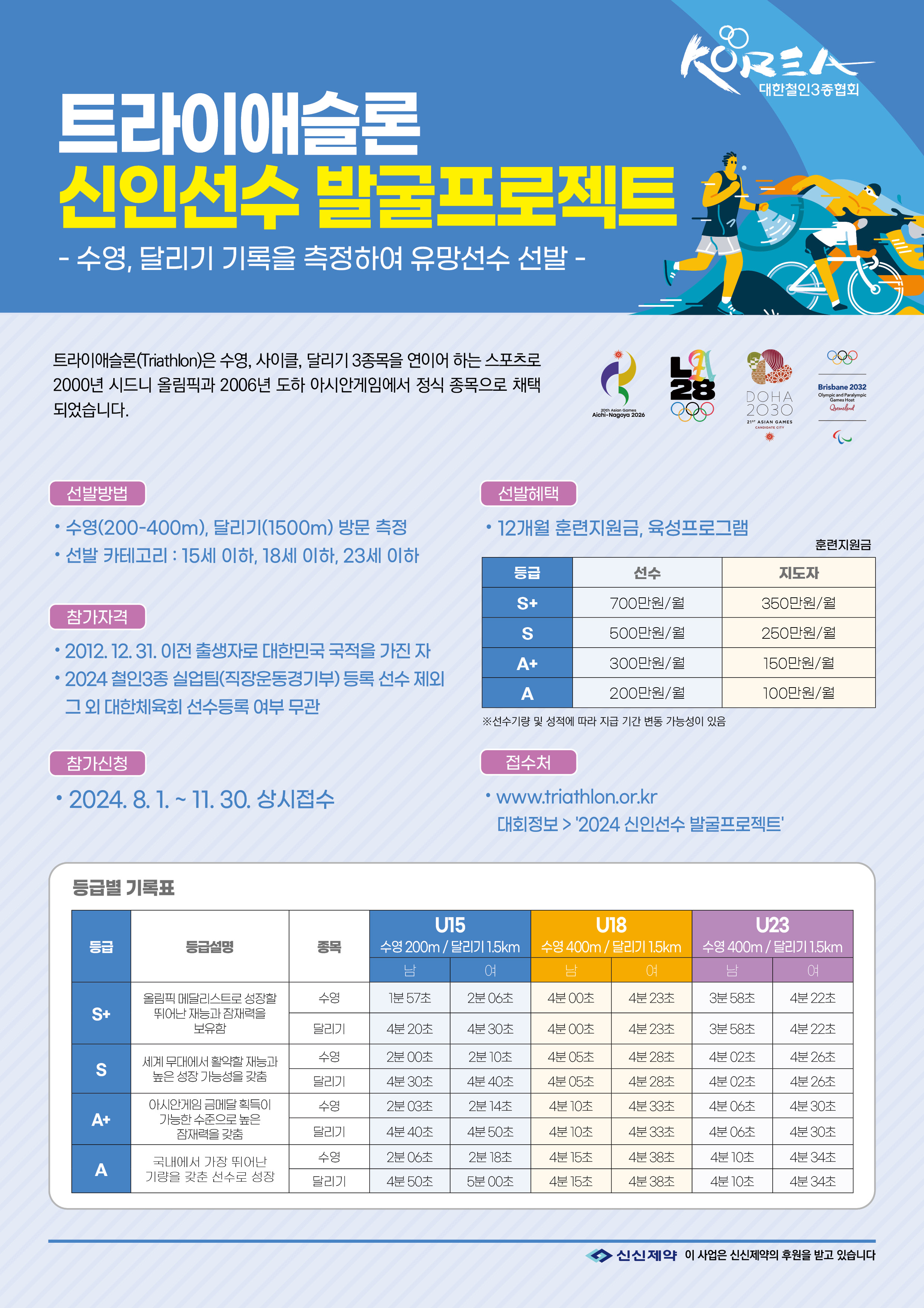 우리 협회에서는 트라이애슬론 신인선수 발굴 및 우수성적을 통한 국위선양의 일환으로 귀 기관 산하 중학교, 고등학교를 대상으로 아래와 같이 신인선수 발굴 프로젝트 홍보를 요청코자 합니다. □ 사업개요 ? 사 업 명: 트라이애슬론 신인선수 발굴프로젝트 ? 신청기간: 2024년 8월 ~ 11월 중 상시 접수 ? 대 상: 2012. 12. 31. 이전 출생자로 대한민국 국적을 가진 자 ? 내 용: 수영, 달리기 2가지 종목을 측정하여 우수선수 지원 ? 선발혜택: 월별 훈련지원금(최대 선수 700만원/지도자 350만원) 등 ? 주최/주관: 대한철인3종협회 붙임 안내문 및 홍보자료 각 1부. 끝