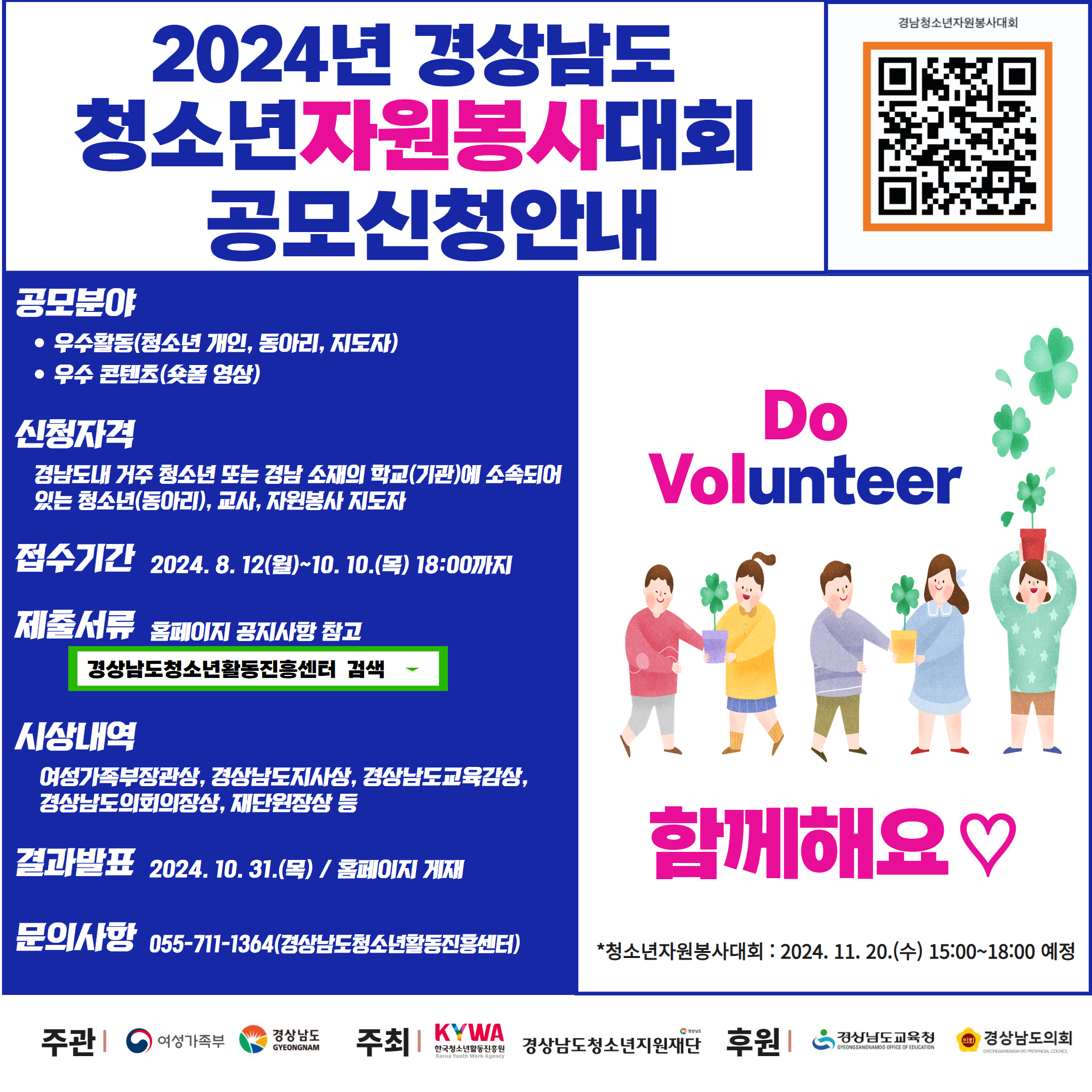 경상남도청소년지원재단에서 도내 우수 자원봉사 활동 사례발굴을 통해 청소년자원 봉사에 대한 관심을 제고하고 참여문화를 확산하고자「2024년도 경상남도 청소년자원 봉사대회」를 개최합니다. 가. 행사개요 1) 행사명: 2024년도 경상남도 청소년자원봉사대회 2) 시상식: 2024. 11. 20.(수) 15:00~18:00 ※ 일정 변동가능성 있음 3) 대상: 청소년(개인, 동아리) 및 지도자, 터전 등 4) 내용: 우수 활동 및 우수 콘텐츠 공모 5) 주최: 여성가족부, 경상남도 6) 주관: 경상남도청소년지원재단, 한국청소년활동진흥원 7) 후원: 경상남도교육청, 경상남도의회 나. 우수활동 및 우수 콘텐츠 공모 1) 접수기간: 2024. 8. 12.(월)~10. 10.(목) 18:00까지 /60일간 2) 신청자격: 경남 도내 거주 청소년 또는 경남 소재의 학교(기관)에 소속되어있는 청소년(동아리), 교사, 자원봉사 지도자 3) 활동기간: 2023. 10. 13.~2024. 10. 10.까지 4) 공모분야: 총 2개 분야, 4개 부문 (붙임2) 신청서식 참고 5) 접수방법: e-mail 접수 후 원본 제출(gsndyouth@naver.com) 6) 결과발표: 2024. 10. 31.(목) / 홈페이지 게재