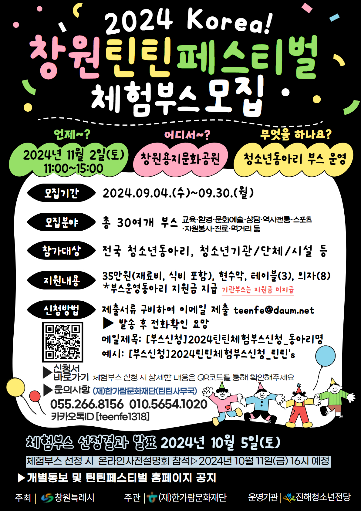 - 기 간: 2024.9.4.(수) ~ 9.30.(월) - 모집대상: 전국 청소년동아리, 청소년 기관/단체/시설 등 30여개 부스 - 모집분야: 교육, 환경, 문화예술, 상담, 역사전통, 스포츠, 자원봉사, 진로, 먹거리 등 - 지원내용: 청소년동아리 부스운영비 35만원(재료비, 식비 포함), 현수막, 테이블(3), 의자(8) ※ 부스운영동아리 지원금 지급, 기관 부스는 지원하지 않음 - 신청방법: 제출서류 구비하여 이메일(teenfe@daum.net) 제출(발송 후 전화확인 요망) - 결과발표: 2024.10.5.(토) 개별통보 및 틴틴페스티벌 홈페이지 공지 - 행사일정: 2024.11.2.(토) 11:00~15:00 창원용지문화공원 - 문 의: (재)한가람문화재단 틴틴사무국 ☎ 055)266-8156 붙임 1. 체험부스 모집안내 및 신청서류 각 1부. 2. 체험부스 모집 포스터 1부. 끝.