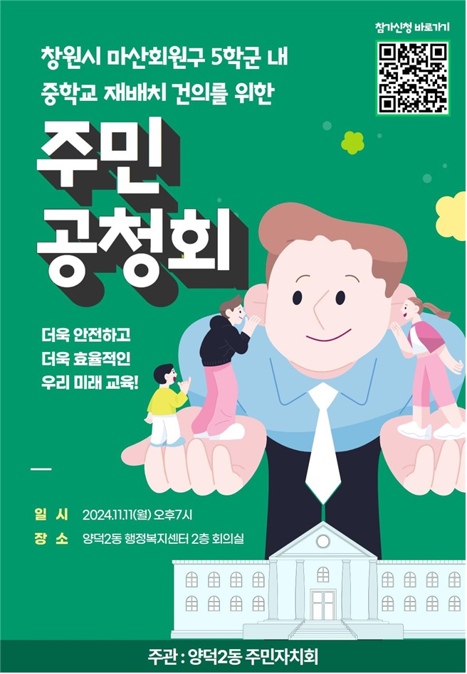양덕2동 주민자치회에서 창원시 마산회원구 5학군 내 중학교 재배치 건의를 위한 주민공청회를 개최하니 많은 학부모님께 안내해 주시기를 바랍니다.붙임 1. 공청회 개최 안내 공문 1부. 2. 공청회 계획안 1부. 끝.