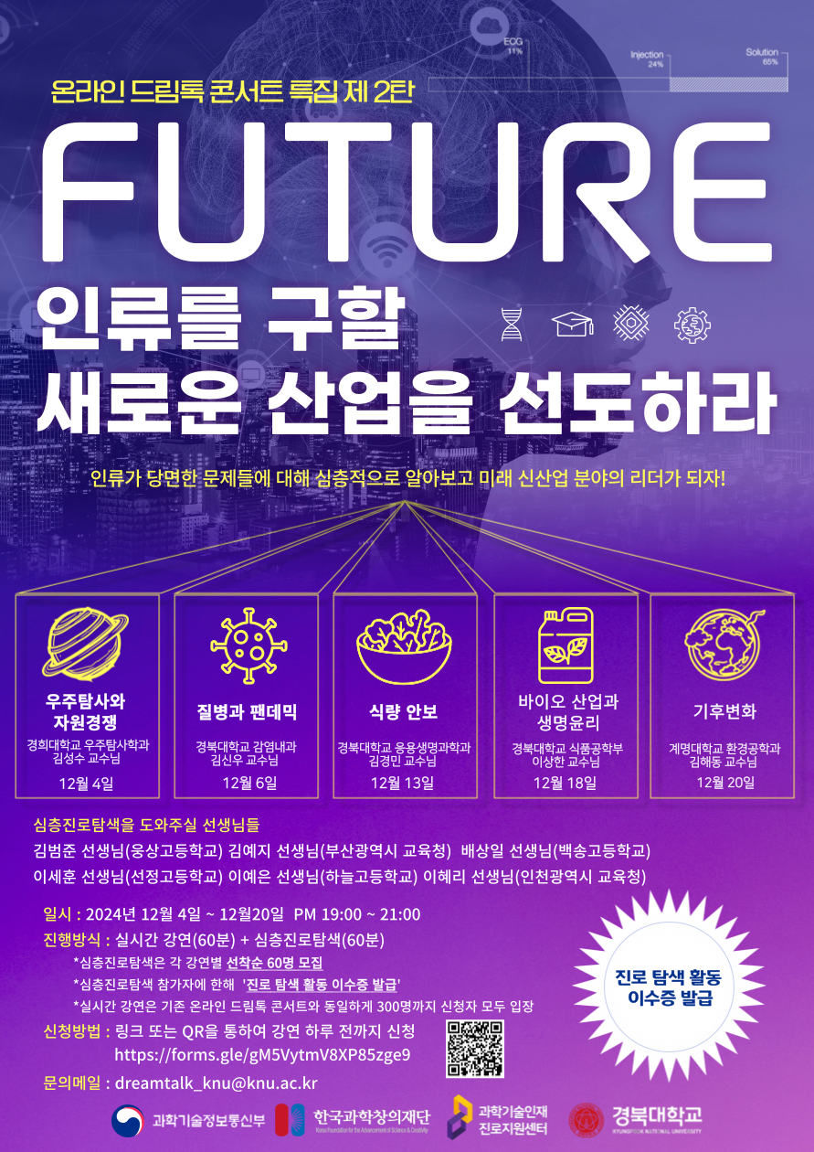 과학기술정보통신부와 우리 재단, 경북대학교는 미래인재들의 과학기술 분야 진로 지원을 위한 <온라인 드림톡 콘서트>를 개최하고 있습니다. 가. 프로그램 개요(※ 세부내용 붙임 안내 포스터 참고) 1) 프로그램명: 인류를 구할 새로운 산업을 선도하라 2) 일시/주제: 2024.12.4.(수) ~ 12.20.(금) 19~21시 / 신산업 분야 5개 주제 3) 내 용: 이공계 진로강연(60분), 심층 진로상담(60분) 4) 참여대상: 중·고등학생 등 5) 운영방식: 비대면 온라인 강연(Zoom) 및 소회의실 활용 심층 진로상담 ※ 진로 탐색 활동 이수증 발급 예정 나. 참여신청 1) 신청기간: 각 강연 1일 전까지 상시 신청 2) 신청방법: 온라인 신청(https://forms.gle/gM5VytmV8XP85zge9), 안내포스터 QR코드 참고 다. 문의: dreamtalk_knu@knu.ac.kr 붙임: 행사안내 포스터 1부. 끝.