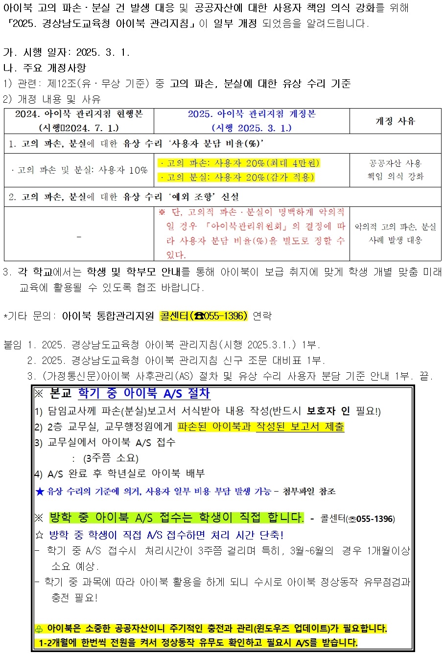 경상남도교육청 미래교육원 콘텐츠운영부_(가정통신문) 아이북 사후관리(AS) 절차 및 수리비 사용자 분담 기준 안내.hwp