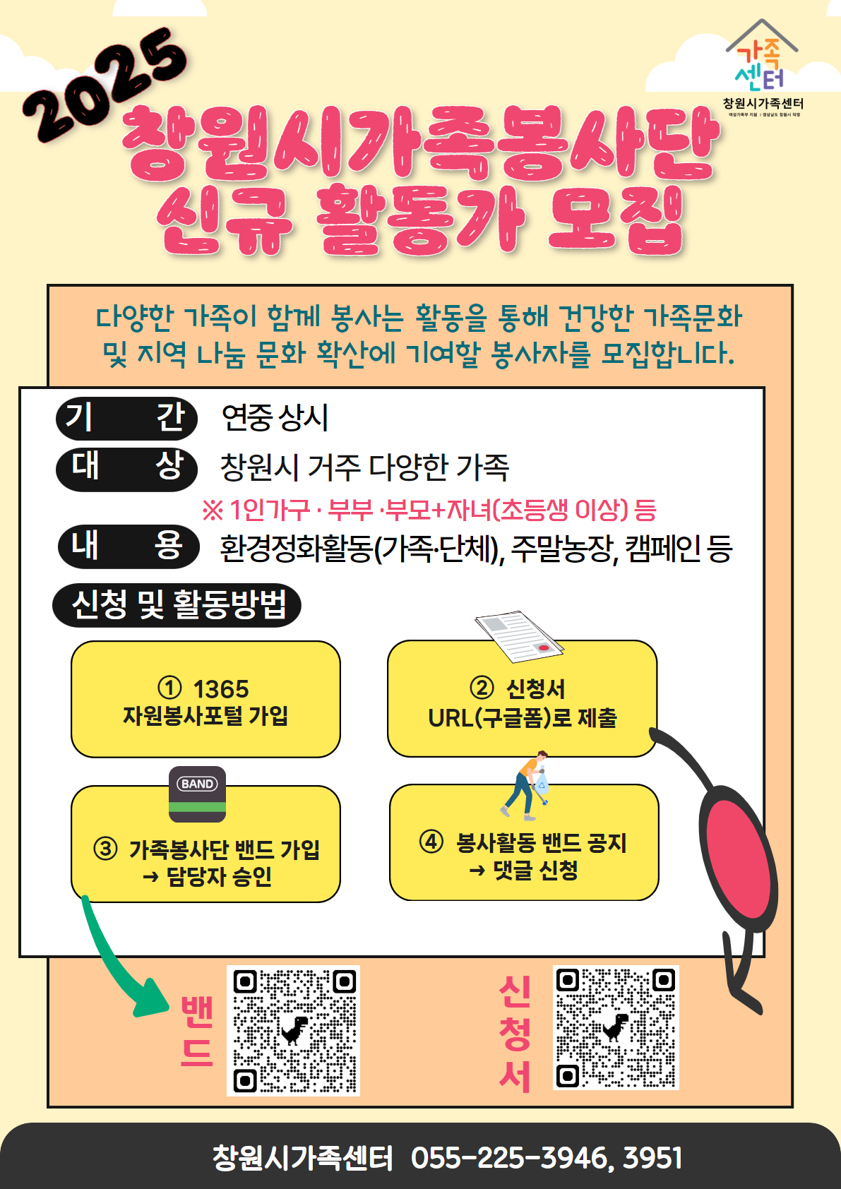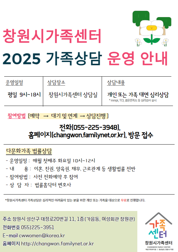*프로그램 개요 구 분 | 가족상담 | 창원시가족봉사단 | 운영일정 | 평일(월~금) 9시~18시 | 연 중(활동별 일정 상이) | 장 소 | 창원시가족센터 교육장(성산구 가음동 소재) 등 | 모집인원 | 상담을 희망하는 개인 또는 가족 | 창원시 거주 다양한 가족 | 내 용 | 대면 심리상담, 다문화가족 법률상담 등 | 환경정화활동, 주말농장, 캠페인 등 | 신청기간 | 연 중 상 시 | 신청방법 | 전화, 홈페이지, 센터방문을 통한 사전예약 및 접수 | 온라인(구글폼) 접수 후 전화 확인 https://forms.gle/s6XStJgmpdmeDoRn8 | 문 의 | 여성가족과(창원시가족센터 ☎225-3951) |