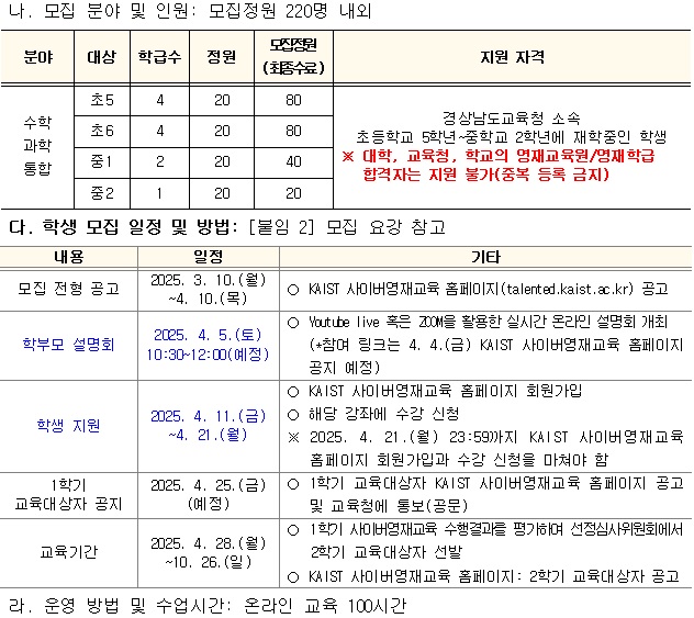 붙임 1. 2025학년도 KAIST 경상남도교육청 사이버영재교육원 모집 요강(요약) 1부. 2. 2025학년도 KAIST 경상남도교육청 사이버영재교육원 모집 요강 1부. 끝.