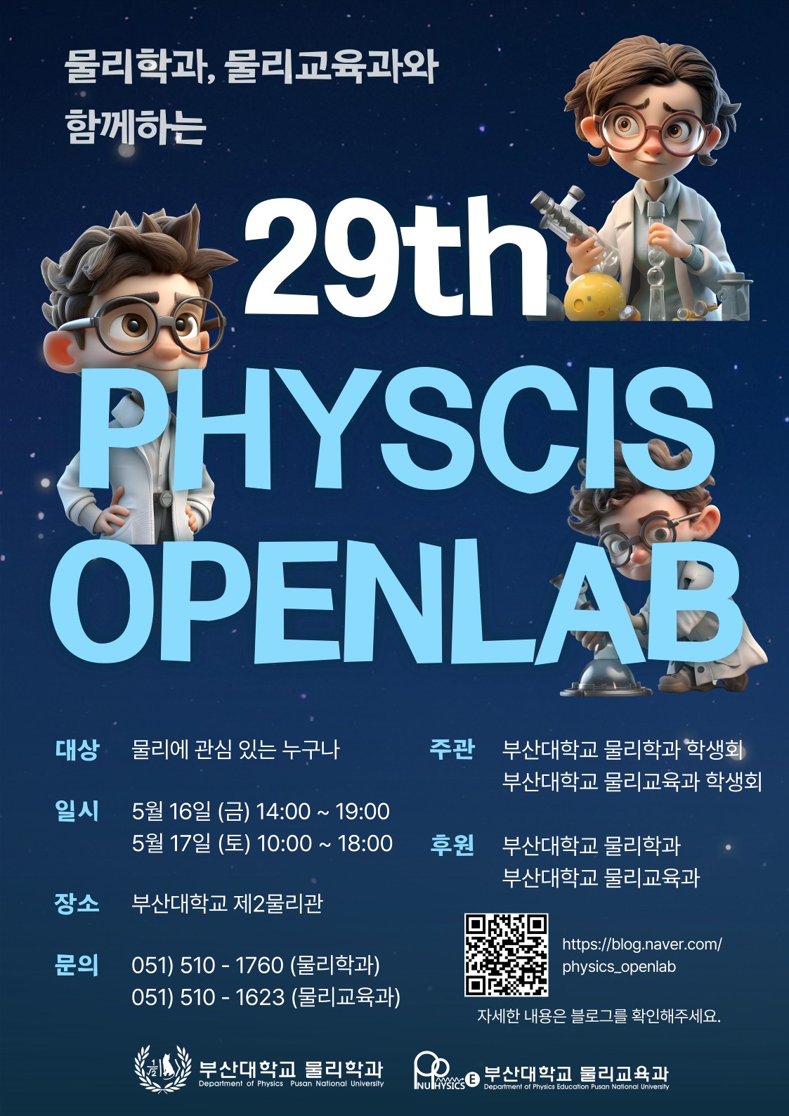 가. 일 시 : 2025.05.16.(금), 14:00 ~ 19:00 2025.05.17.(토), 10:00 ~ 18:00 나. 장 소 : 부산대학교 제2물리관 (부산광역시 금정구 부산대학로 63번길 2, 장전동) 다. 행사내용 : [붙임] 제29회 물리오픈랩 리플렛 참조 라. 참가대상 :초.중.고등학생, 일반인 누구나 마. 협조요청사항 - 물리오픈랩은 교과서로만 배웠던 각종 물리법칙들을 재미있는 실험을 통해 피부로 느끼게 하고, 물리학을 보다 친숙한 생활속 학문이라는 인식을 심어주기 위하여 중.고등학생과 일반인들 대상으로 하는 물리실험시연 행사입니다. - 물리오픈랩은 물리교육과, 물리학과 대학생들이 지난 3개월 동안 직접 기획하고, 교수진의 자문을 받아 준비하고 있으며, 중등물리실험, 첨단과학실험, 함께하는 물리실험 등 다양한 볼거리가 준비되어 있습니다. 각 실험마다 대학생들이 직접 원리를 설명해주고, 질문도 주고 받을 수 있습니다. 이에 많은 학생들이 관람할 수 있도록 협조하여 주시기 바랍니다.