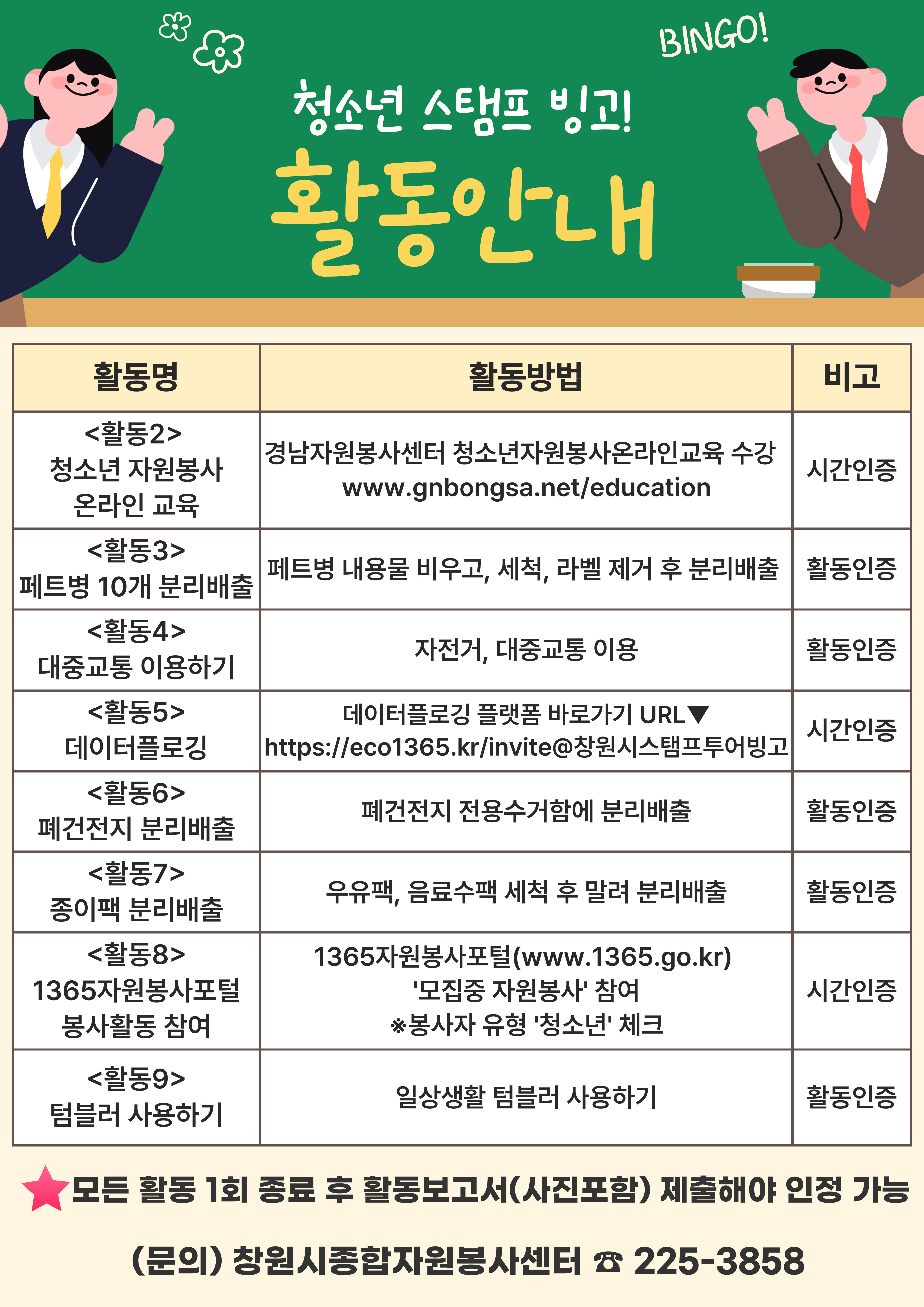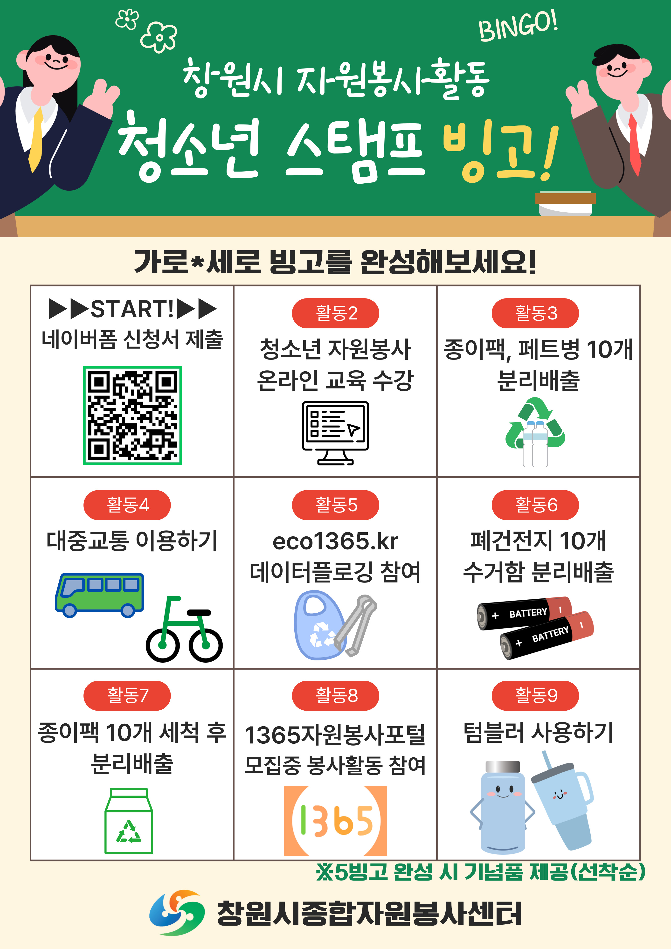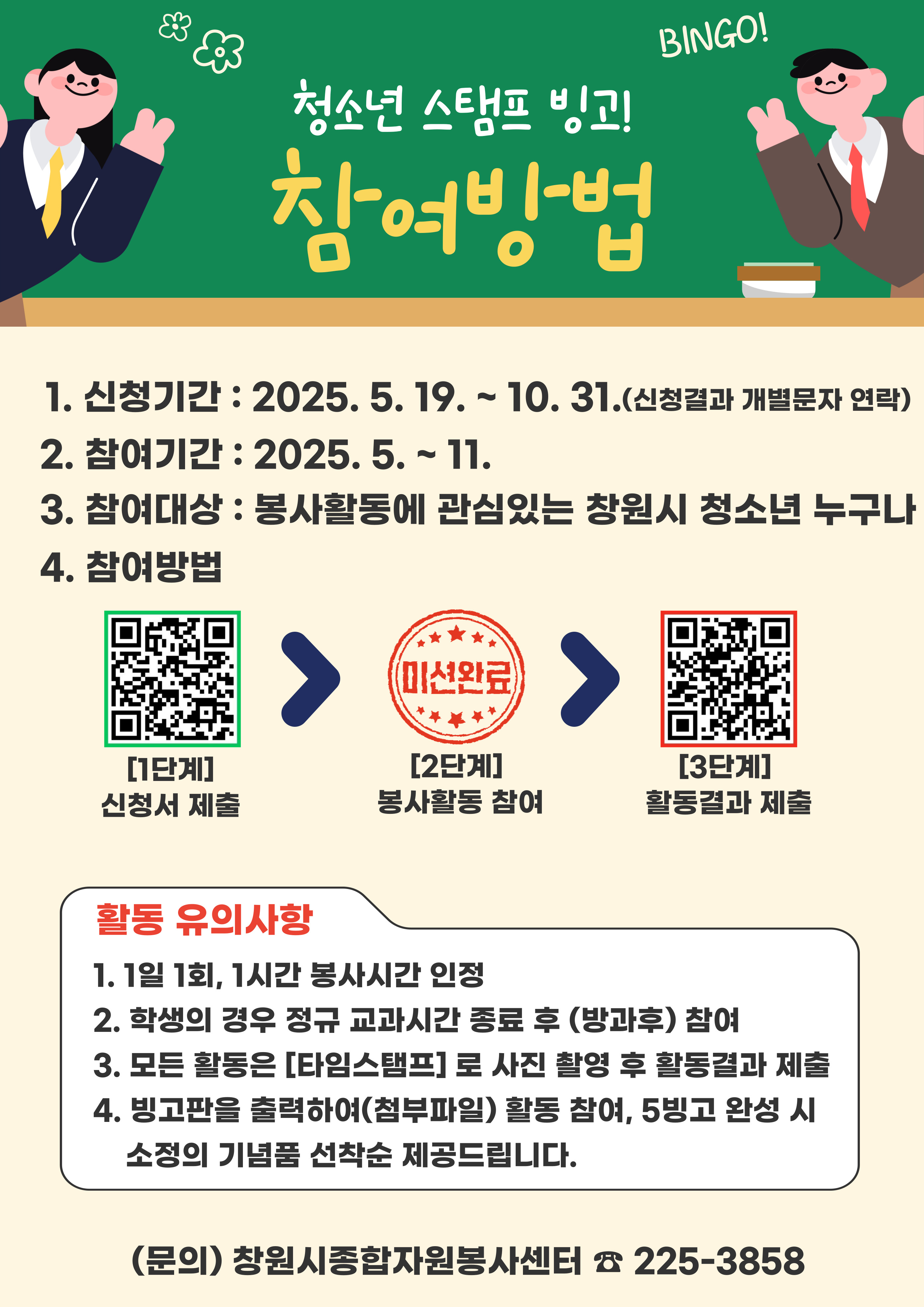 창원시에서는 청소년 자원봉사활성화 및 자원봉사 참여 분위기를 확산시키고자『청소년 자원봉사자 스탬프 투어, 빙고』를 운영·모집. 가. 신청기간: 2025. 5. 19.(월) ~ 10. 31.(금) 나. 참여기간: 2025. 5. 19.(월) ~ 11. 30.(일) 나. 인 원: 100명 (선착순) 다. 모집대상 : 봉사활동에 관심있는 창원시 청소년 누구나 라. 활동내용 : 빙고판 활동내용(대중교통 이용, 종이팩 분리 등) 5빙고 완성 마. 참여방법 : 온라인 신청(QR코드 제출 - 신청서, 활동결과 제출) ※ 붙임참조 바. 문 의 처 : 창원시종합자원봉사센터 (☏ 225-3858) 붙임 1. 빙고판 1부. 2. 활동안내 1부. 3. 참여방법 1부. 끝.