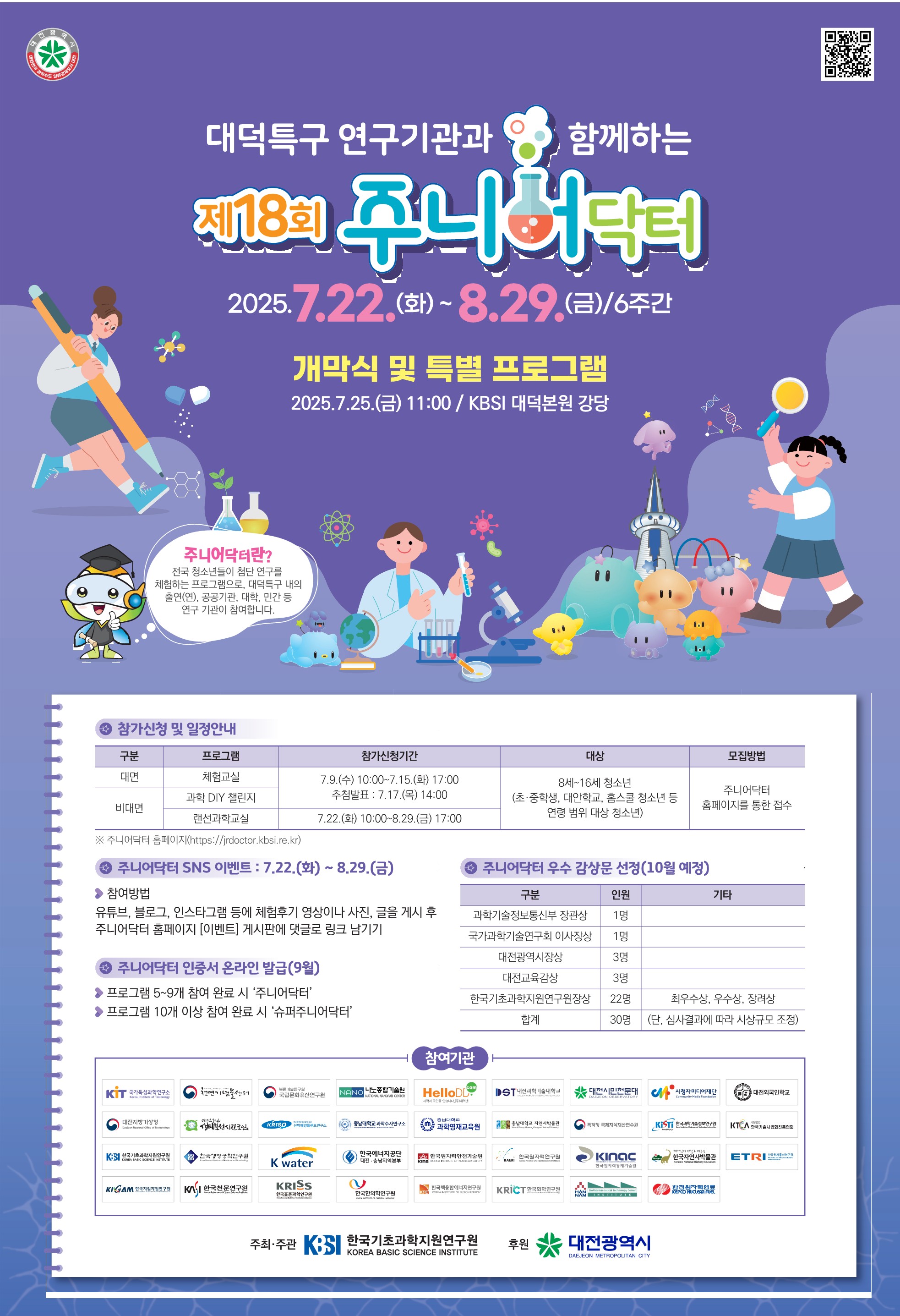 한국기초과학지원연구원은 미래 과학기술 꿈나무 육성을 위하여 2008년부터 매년「과학기술 청소년 박사 ? 주니어닥터」를 운영하고 있으며, 올해에도 아래와 같이 개최하오니 많은 청소년들이 참가할 수 있도록 홍보하여 주시기 바랍니다. - 아 래 - 가. 행 사 명 :2025 제18회 주니어닥터 나. 개 막 식 : 2025.07.25.(금) 11:00 / 한국기초과학지원연구원 대덕본원 강당 다. 주최·주관 : 한국기초과학지원연구원 / 후원 : 대전광역시 라. 참여기관 :대전대덕특구 내 출연(연), 공공기관, 대학, 민간 등35개 기관/