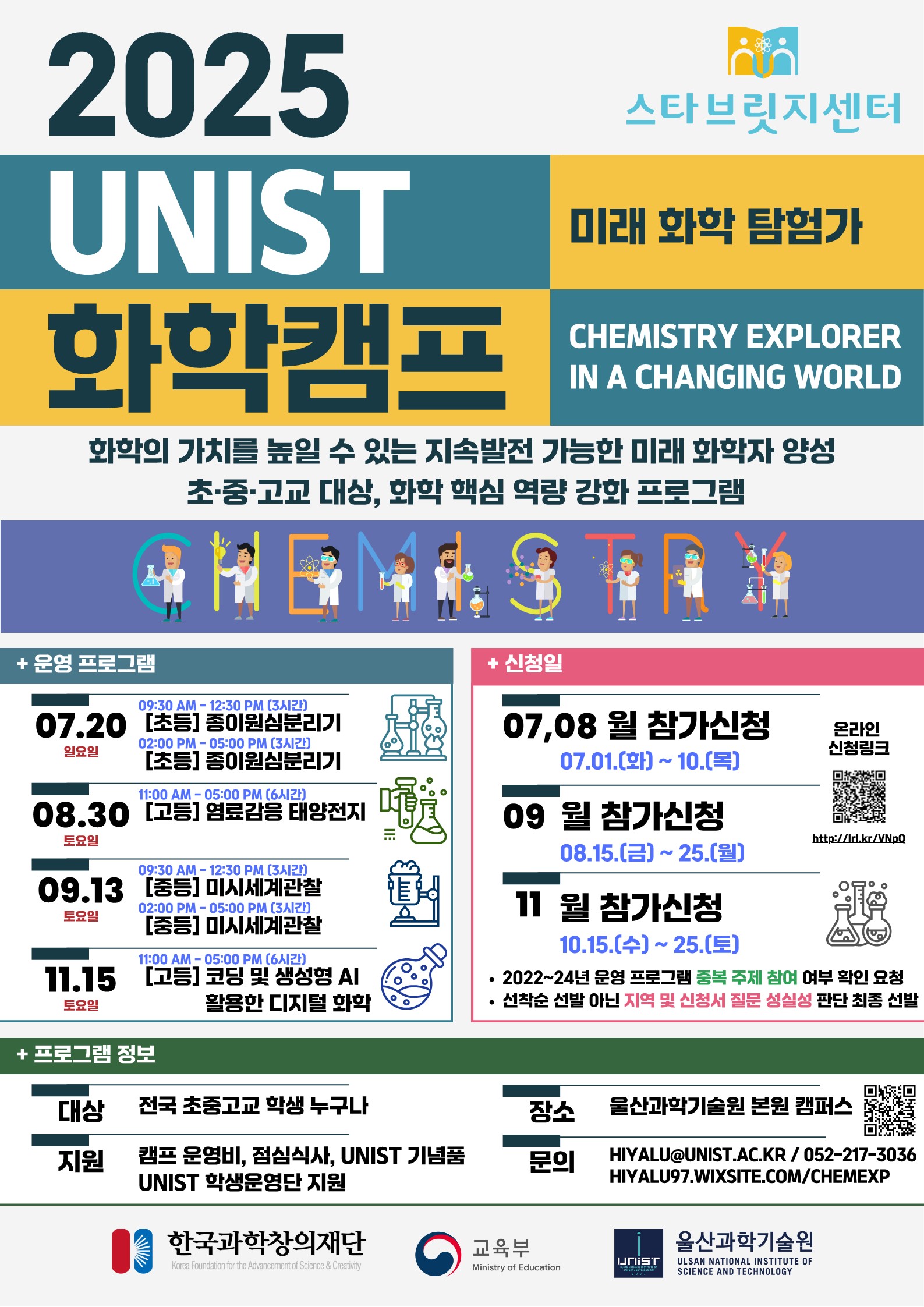 울산과학기술원에서는 한국과학창의재단에서 지원받아 경쟁력 있는 미래 화학자를 양성하기 위해 초·중·고교 학생들을 대상으로 [2025 스타브릿지센터 with UNIST] 화학캠프 프로그램을 운영합니다. 본 프로그램은 첨단 화학을 학습하는 핵심 역량 강화 운영, 사고 능력을 확장하며 재구성할 수 있는 미래 화학 탐험가로서 실생활 적용 가능한 과학 어울림 네트워크에 참여하여 창의적인 전문 인재로 성장하는 기회 제공합니다. 위와 관련하여 새로운 세상을 맞이할 청소년이 첨단 화학 강연과 재미있는 화학 실험을 경험할 수 있는 [2025 스타브릿지센터 with UNIST] 화학캠프 프로그램에 차세대 화학 탐험가인 여러분을 초대합니다. 자율적인 참여를 위해 많은 홍보 부탁드립니다. 가. 프로그램명: [2025 스타브릿지센터 with UNIST] 화학캠프 나. 목표: 과학의 가치를 높일 수 있는 지속발전 가능한 미래 화학자 양성 다. 일시: (초등) 2025.07.20.(일) / 2회 / 종이 원심분리기 제작 (고등) 2025.08.30.(토) / 1회 / 염료감응 태양전지 제작 (중등) 2025.09.13.(토) / 2회 / 미시세계관찰 (고등) 2025.11.15.(토) / 1회 / 코딩 및 생성형 AI를 활용한 디지털 화학 라. 장소: 울산과학기술원 본원 캠퍼스 마. 대상: (개인) 전국 초·중·고교 학생 누구나 바. 운영: 기본 강연, 화학실험, 활동일지, 캠퍼스 투어 사. 신청: 스타브릿지센터 with UNIST 홈페이지를 통한 개별 신청 * 홈페이지: https://hiyalu97.wixsite.com/chemexp 아. 신청기간: (1차) 2025.07.01.(화)~10.(목) / 07, 08 월 프로그램 신청 (2차) 2025.08.15.(금)~25.(월) / 09 월 프로그램 신청 (3차) 2025.10.15.(수)~25.(토) / 11 월 프로그램 신청 자. 결과발표: 개별 신청학생 이메일과 문자 통보 붙임 1. 2025 스타브릿지센터 화학캠프 안내문 1부. 2. 2025 스타브릿지센터 화학캠프 포스터 1부. 끝.