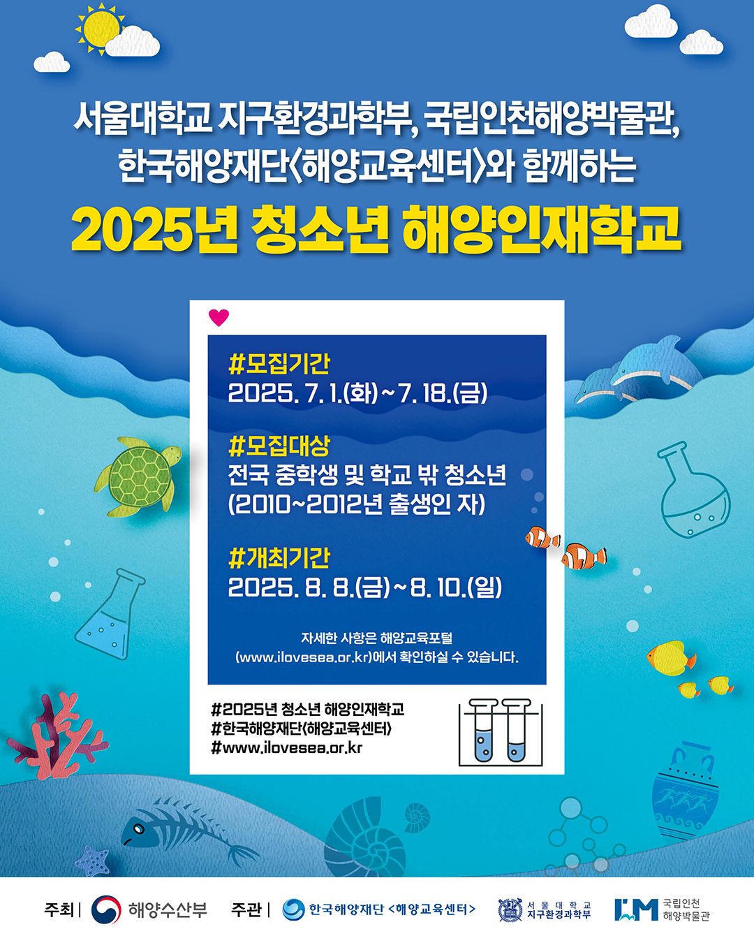해양수산부는 2015년부터 청소년들을 대상으로 바다에 대한 이해와 지식을 겸비한 인재로 양성하기위해 해양인재학교를 운영하고 있습니다. 올해로 10번째를 맞이하는 이번 인재학교는 전국 청소년을 대상으로 (재)한국해양재단 해양교육센터, 서울대학교 및 국립인천해양박물관과 여름캠프를 진행하오니 청소년들이 즐겁게 바다를 배우고 체험할 수 있는 기회를 누릴 수 있도록 안내해주시기 바랍니다. - 아 래 - ㅇ (사업명) 2025년 청소년 해양인재학교 * (주최/주관) 해양수산부/(재)한국해양재단 해양교육센터, 서울대학교 지구환경과학부, 국립인천해양박물관 ㅇ (기간/장소) '25.8.8(금) ~ 10(일) / 서울·인천 ㅇ (참가대상) 전국 중학생(학교 밖 청소년 포함, 2010~2012년 출생인 자) 30명 ㅇ (주요프로그램) 해양과학·문화 기초 교육, 캠퍼스 투어, 기관 견학 등 ㅇ (참가신청) 해양교육포털(www.ilovesea.or.kr)을 통한 온라인 모집 * (신청경로) 해양교육포털→해양교육센터→청소년 해양교육 프로그램→참여신청 ㅇ (문의처) (재)한국해양재단 해양교육센터 담당자(070-4610-1085 / 02-742-5280) 붙임 1. 2025년 청소년 해양인재학교 개최계획(참가신청서 및 동의서 포함) 1부. 2. 2025년 청소년 해양인재학교 웹포스터 1부. 끝.