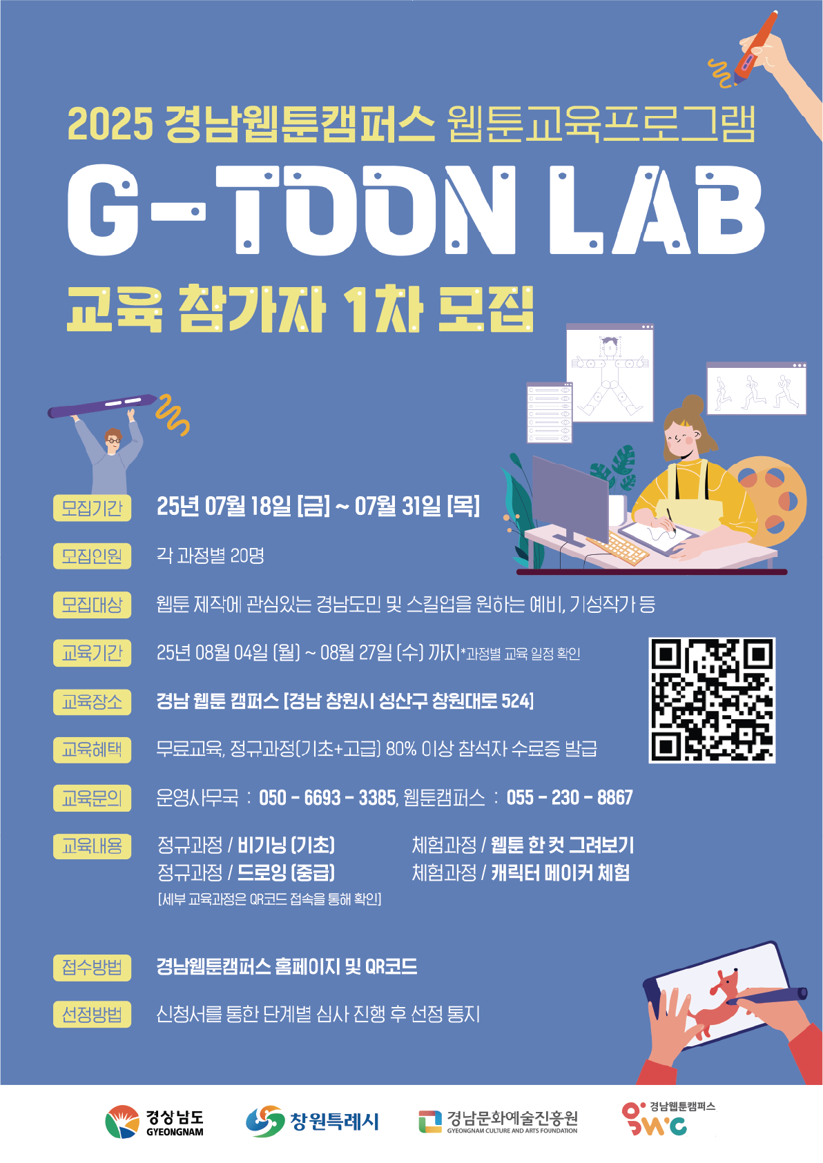 (재)경남문화예술진흥원 경남웹툰캠퍼스에서는 「웹툰 교육 프로그램(1차)」에 참여할 교육생을 모집하고 있습니다. 가. 교 육 명: 2025 경남웹툰캠퍼스 웹툰 교육 프로그램 나. 모집대상: 경남도민 및 예비·기성 작가 다. 모집기간: 2025. 7. 18(금) ~ 7. 31(목) 라. 교육기간: 2025. 8. 4(월) ~ 8. 27(수) 마. 교육장소: 경남웹툰캠퍼스(경남 창원시 성산구 창원대로 524) 바. 교육혜택: 전과정 무료교육, 교육 수료증 발급(과정 80% 이상 출석 시) 마. 신청방법: 경남문화예술진흥원 및 경남웹툰캠퍼스 누리집 내용 확인 및 구글폼 접수 바. 문 의 - 경남웹툰캠퍼스 웹툰 교육 프로그램 운영 사무국: 050-6693-3385 - (재)경남문화예술진흥원 콘텐츠산업본부 차세대콘텐츠팀 담당자: 055-230-8867 붙임 1. 2025 경남웹툰캠퍼스 웹툰 교육 프로그램 교육생 모집공고(1차) 건의 1부. 2. 2025 경남웹툰캠퍼스 웹툰 교육 프로그램 홍보 포스터 1부. 끝.