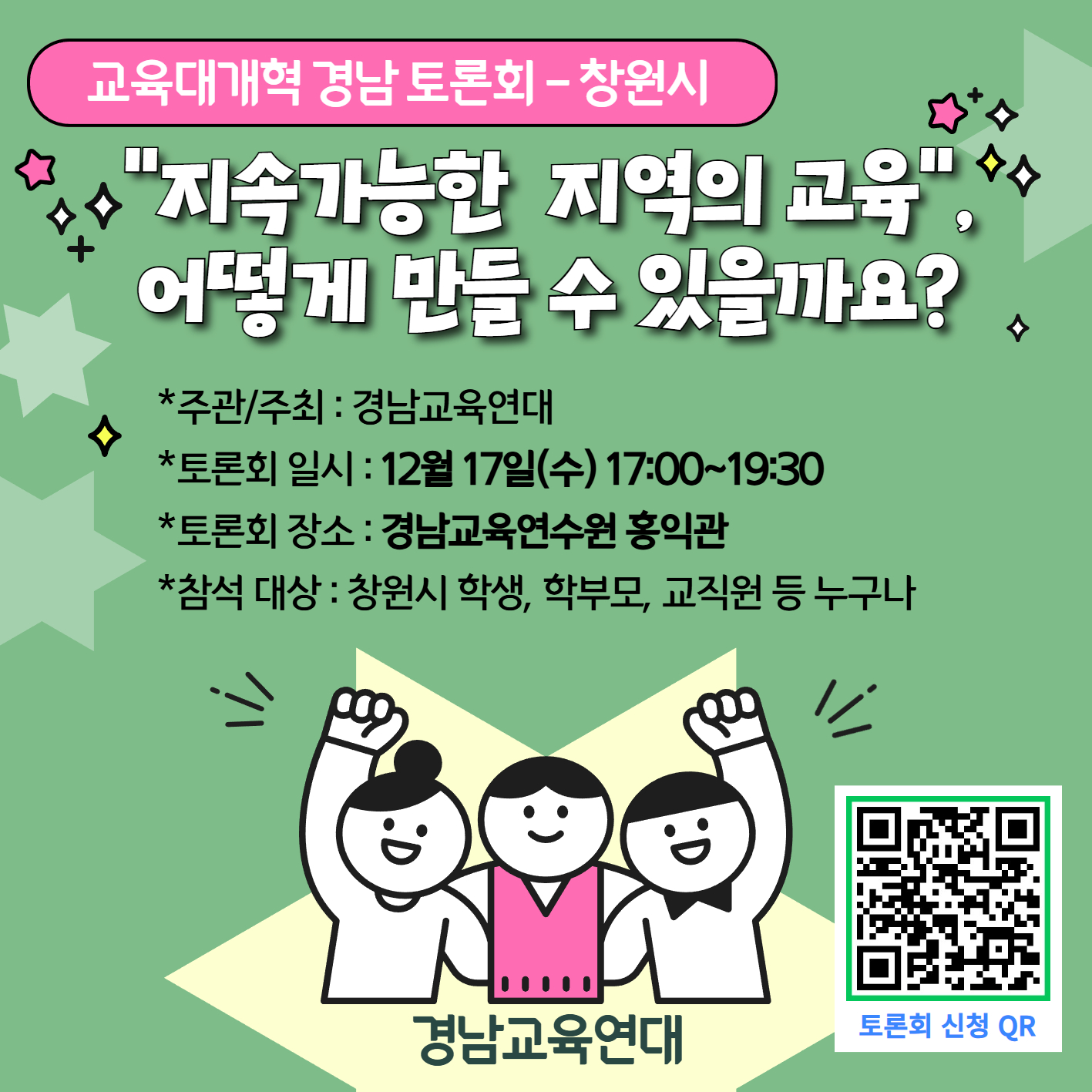 가. 토론회명: 교육대개혁 경남토론회(창원시) 나. 주제: 지속가능한 지역의 교육, 어떻게 만들 수 있을까? 다. 주최: 경남교육연대 라. 일시: 2025. 12. 17.(수) 17:00~19:30 마. 장소: 경남교육연수원 홍익관 바. 대상: 창원시 학생(중학생, 고등학생, 학교밖 청소년), 학부모, 교직원 누구나 사. 참가신청 기한: ~ 2025. 12. 15.까지 아. 참가신청 폼: 교육대개혁 경남토론회(창원시) 신청 - 네이버 폼